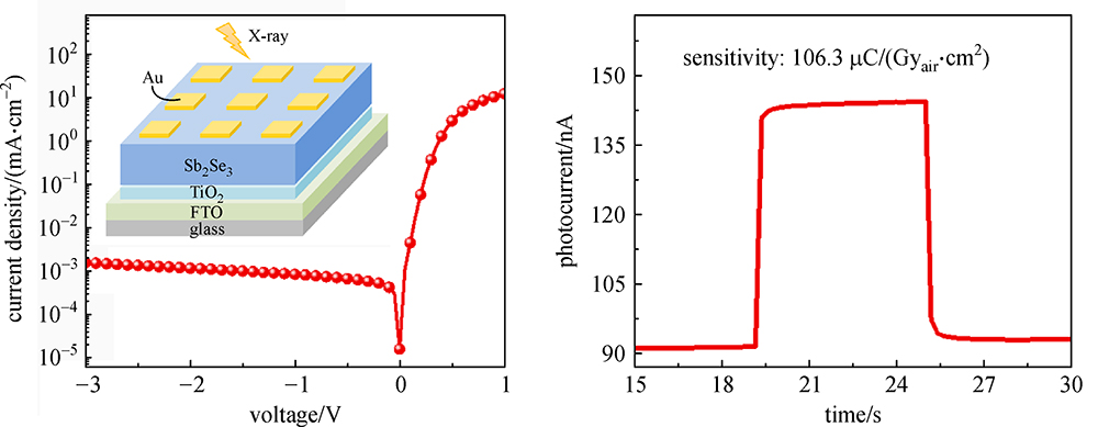 Direct X-ray detectors are considered as competitive next-generation X-ray detectors because of their high spatial resolution, high sensitivity, and simple device configuration. However, their potential is largely limited by the imperfections of traditional materials, such as the low crystallization temperature of α-Se and the low atomic numbers of α-Si and α-Se. Here, we report the Sb2Se3 X-ray thin-film detector with a p–n junction structure, which exhibited a sensitivity of 106.3 µC/(Gyair·cm2) and response time of <2.5 ms. This decent performance and the various advantages of Sb2Se3, such as the average atomic number of 40.8 and μτ product (μ is the mobility, and τ is the carrier lifetime) of 1.29 × 10−5 cm2/V, indicate its potential for application in X-ray detection.