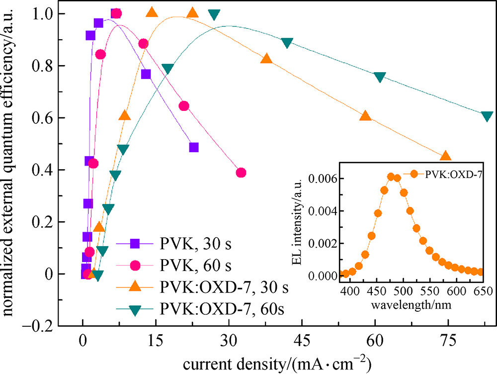 Thermally activated delayed fluorescence (TADF) organic light-emitting diodes (OLEDs) have been demonstrated in applications such as displays and solid-state lightings. However, weak stability and inefficient emission of blue TADF OLEDs are two key bottlenecks limiting the development of solution processable displays and white light sources. This work presents a solution-processed OLED using a blue-emitting TADF small molecule bis[4-(9,9-dimethyl-9,10-dihydroacridine)phenyl]sulfone (DMAC-DPS) as an emitter. We comparatively investigated the effects of single host poly(N-vinylcarbazole) (PVK) and a co-host of 60% PVK and 30% 2,2′-(1,3-phenylene)-bis[5-(4-tert-butylphenyl)-1,3,4-oxadiazole] (OXD-7) on the device performance (the last 10% is emitter DMAC-DPS). The co-host device shows lower turn-on voltage, similar maximum luminance, and much slower external quantum efficiency (EQE) roll-off. In other words, device stability improved by doping OXD-7 into PVK, and the device impedance simultaneously and significantly reduced from 8.6 × 103 to 4.2 × 103 W at 1000 Hz. Finally, the electroluminescent stability of the co-host device was significantly enhanced by adjusting the annealing temperature.