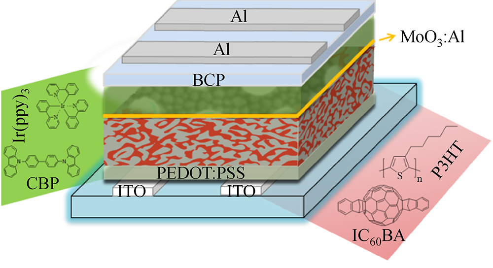 A light-emitting organic solar cell (LE-OSC) with electroluminescence (EL) and photovoltaic (PV) properties is successfully fabricated by connecting the EL and PV units using a MoO3:Al co-evaporation interfacial layer, which has suitable work function and good transmittance. PV and EL units are fabricated based on poly(3-hexylthiophene) (P3HT)-indene-C60 bisadduct (IC60BA) blends, and 4,4′-bis (N-carbazolyl) biphenyl-fac-tris (2-phenylpyridine) iridium (Ir(ppy)3), respectively. The work function and the transmittance of the MoO3:Al co-evaporation are measured and adjusted by the ultraviolet photoelectron spectroscopy and the optical spectrophotometer to obtain the better bi-functional device performance. The forward- and reverse-biased current density-voltage characteristics in dark and under illumination are evaluated to better understand the operational mechanism of the LE-OSCs. A maximum luminance of 1550 cd/m2 under forward bias and a power conversion efficiency of 0.24% under illumination (100 mW/cm2) are achieved in optimized LE-OSCs. The proposed device structure is expected to provide valuable information in the film conditions for understanding the polymer blends internal conditions and meliorating the film qualities.