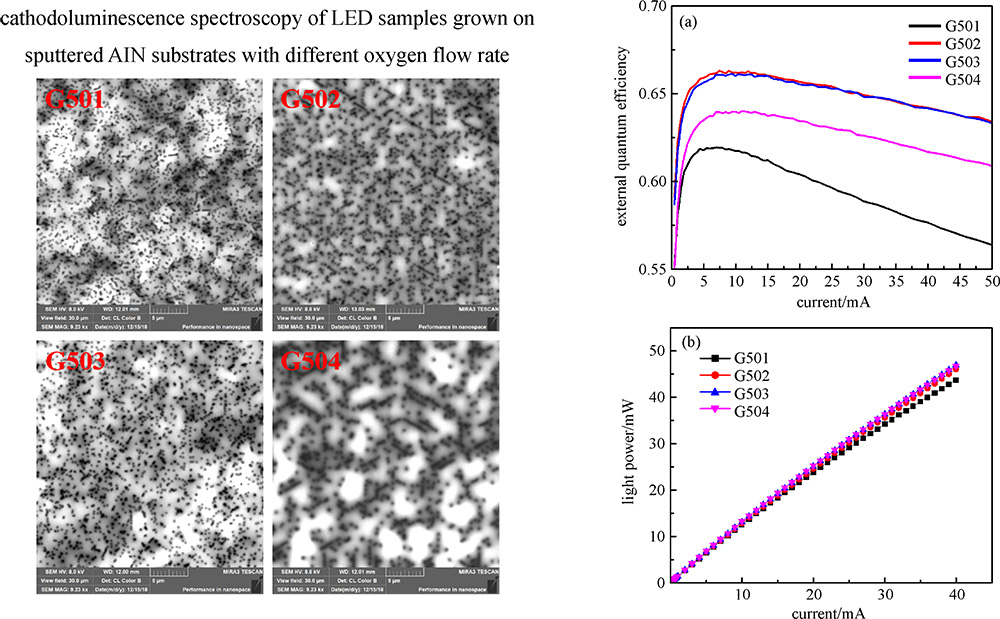 Indium Gallium Nitride based blue light-emitting diodes (LEDs) suffer from insufficient crystal quality and serious efficiency droop in large forward current. In this paper, the InGaN-based blue LEDs are grown on sputtered aluminum nitride (AlN) films to improve the device light power and weaken the efficiency droop. The effects of oxygen flow rate on the sputtering of AlN films on sapphire and device performance of blue LEDs are studied in detail. The mechanism of external quantum efficiency improvement is related to the change of V-pits density in multiple quantum wells. The external quantum efficiency of 66% and 3-V operating voltage are measured at a 40-mA forward current of with the optimal oxygen flow rate of 4 SCCM.