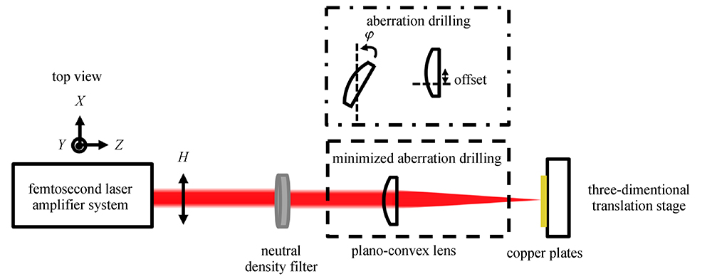A near-infrared femtosecond laser is focused by a 100 mm-focal-length plano-convex lens to form a laser filament, which is employed to drill holes on copper targets. By shifting or rotating the focusing lens, additional aberration is imposed on the focused laser beam, and significant influence is produced on the aspect ratio and cross-sectional shape of the micro-holes. Experimental results show that when proper aberration is introduced, the copper plate with a thickness of 3 mm can be drilled through with an aspect ratio of 30, while no through-holes can be drilled on 3-mm-thickness copper plates by femtosecond laser with minimized aberration. In addition, when femtosecond laser filament with large astigmatism is used, micro-holes that had a length to width ratio up to 3.3 on the cross-section are obtained. Therefore, the method proposed here can be used to fabricate long oval holes with high aspect ratios.