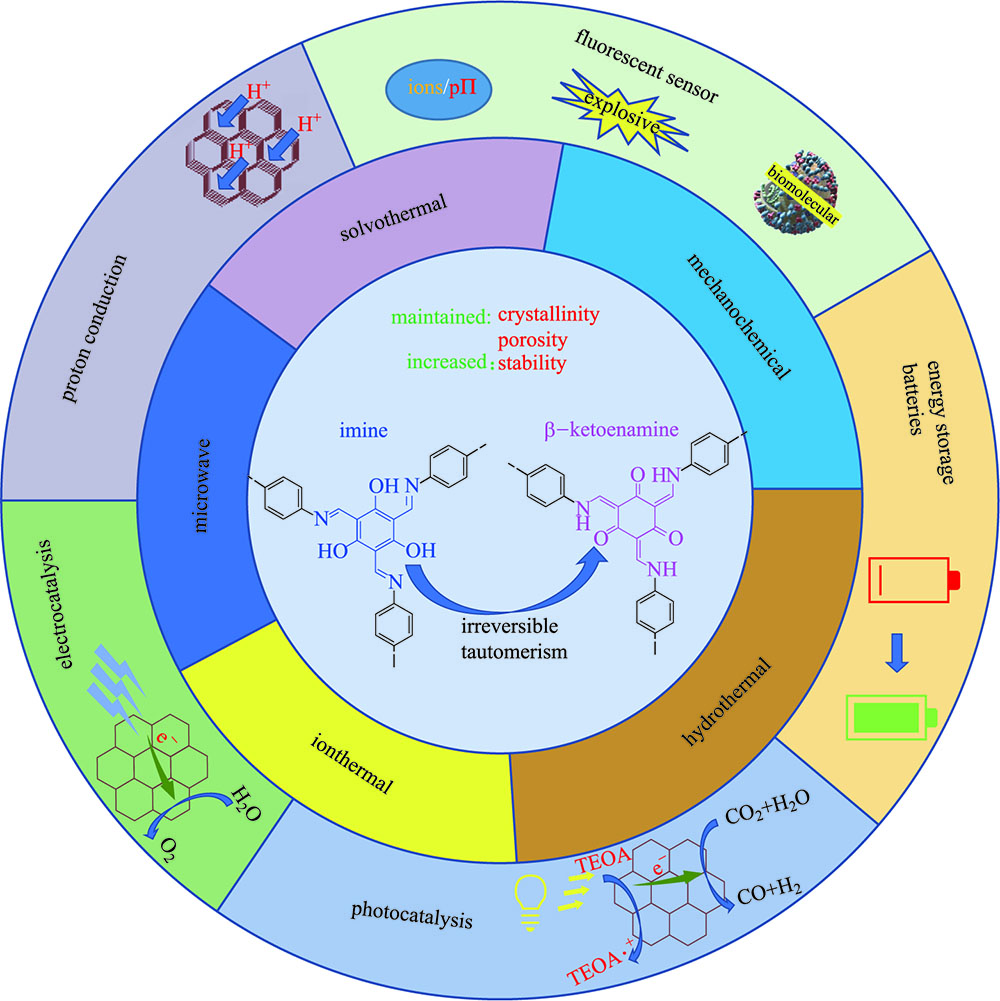 Covalent organic frameworks (COFs) are one class of porous materials with permanent porosity and regular channels, and have a covalent bond structure. Due to their interesting characteristics, COFs have exhibited diverse potential applications in many fields. However, some applications require the frameworks to possess high structural stability, excellent crystallinity, and suitable pore size. COFs based on β-ketoenamine and imines are prepared through the irreversible enol-to-keto tautomerization. These materials have high crystallinity and exhibit high stability in boiling water, with strong resistance to acids and bases, resulting in various possible applications. In this review, we first summarize the preparation methods for COFs based on β-ketoenamine, in the form of powders, films and foams. Then, the effects of different synthetic methods on the crystallinity and pore structure of COFs based on β-ketoenamine are analyzed and compared. The relationship between structures and different applications including fluorescence sensors, energy storage, photocatalysis, electrocatalysis, batteries and proton conduction are carefully summarized. Finally, the potential applications, large-scale industrial preparation and challenges in the future are presented.