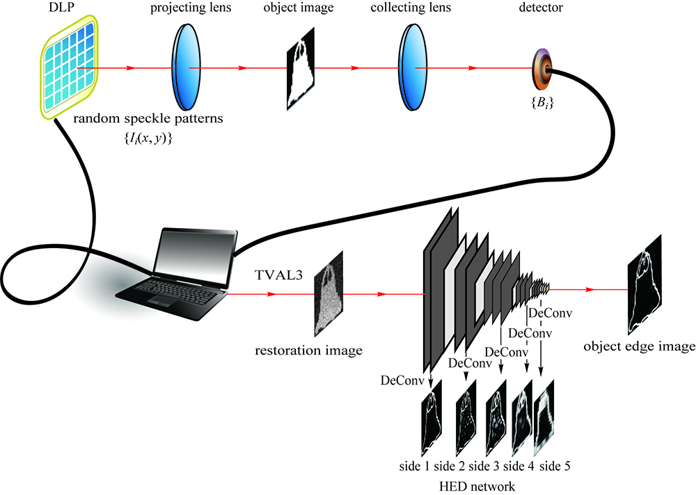 In this paper, we present an edge detection scheme based on ghost imaging (GI) with a holistically-nested neural network. The so-called holistically-nested edge detection (HED) network is adopted to combine the fully convolutional neural network (CNN) with deep supervision to learn image edges effectively. Simulated data are used to train the HED network, and the unknown object’s edge information is reconstructed from the experimental data. The experiment results show that, when the compression ratio (CR) is 12.5%, this scheme can obtain a high-quality edge information with a sub-Nyquist sampling ratio and has a better performance than those using speckle-shifting GI (SSGI), compressed ghost edge imaging (CGEI) and subpixel-shifted GI (SPSGI). Indeed, the proposed scheme can have a good signal-to-noise ratio performance even if the sub-Nyquist sampling ratio is greater than 5.45%. Since the HED network is trained by numerical simulations before the experiment, this proposed method provides a promising way for achieving edge detection with small measurement times and low time cost.
