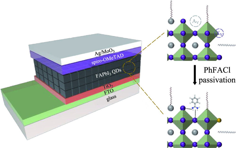 Formamidinium lead triiodide (FAPbI3) perovskite quantum dots (PQDs) show great advantages in photovoltaic applications due to their ideal bandgap energy, high stability and solution processability. The anti-solvent used for the post-treatment of FAPbI3 PQD solid films significantly affects the surface chemistry of the PQDs, and thus the vacancies caused by surface ligand removal inhibit the optoelectronic properties and stability of PQDs. Here, we study the effects of different anti-solvents with different polarities on FAPbI3 PQDs and select a series of organic molecules for surface passivation of PQDs. The results show that methyl acetate could effectively remove surface ligands from the PQD surface without destroying its crystal structure during the post-treatment. The benzamidine hydrochloride (PhFACl) applied as short ligands of PQDs during the post-treatment could fill the A-site and X-site vacancies of PQDs and thus improve the electronic coupling of PQDs. Finally, the PhFACl-based PQD solar cell (PQDSC) achieves a power conversion efficiency of 6.4%, compared to that of 4.63% for the conventional PQDSC. This work provides a reference for insights into the surface passivation of PQDs and the improvement in device performance of PQDSCs.