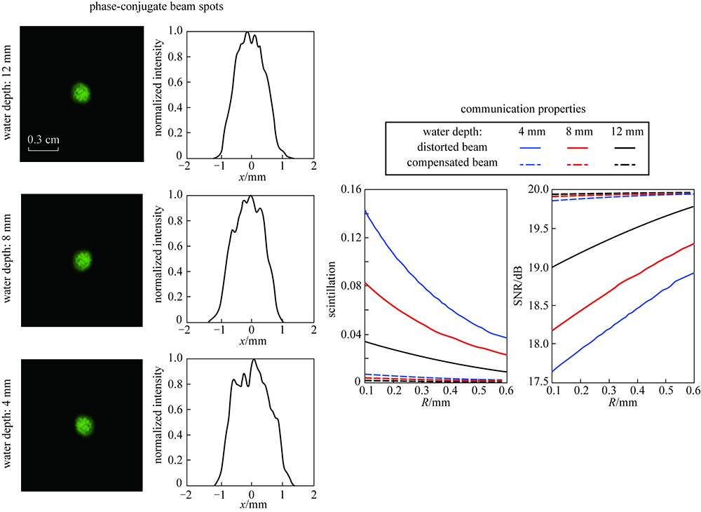 Water surface wave turbulence is one of the factors affecting the performances of underwater optical wireless communication (UOWC) systems. In our research, a phase-conjugate beam was used to correct the beam distortion and enhance the communication performances when a system is subject to surface wave turbulence. The phase-conjugate beam was generated by a phase-conjugate mirror (PCM), and a turbulence generator was used to generate surface wave turbulence in the experiment. We calculated the beam centroid distribution and the results showed that the phase-conjugate beam had a better propagation performance than the distorted beam at the different water depths. The root mean square (RMS) of the beam centroid for the phase-conjugate beam was 11 times less than that for the distorted beam, which meant that the phase-conjugate beam could effectively correct the beam drift. We further investigated the scintillation index and the signal-to-noise ratio (SNR); the results showed that the phase-conjugate beam was able to reduce the scintillation and an obvious improvement in SNR could be obtained. This research has the potential to be applied in UWC.