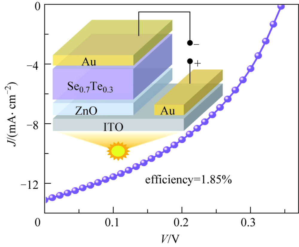Selenium (Se) element is a promising light-harvesting material for solar cells because of the large absorption coefficient and prominent photoconductivity. However, the efficiency of Se solar cells has been stagnated for a long time owing to the suboptimal bandgap (> 1.8 eV) and the lack of a proper electron transport layer. In this work, we tune the bandgap of the absorber to the optimal value of Shockley–Queisser limit (1.36 eV) by alloying 30% Te with 70% Se. Simultaneously, ZnO electron transport layer is selected because of the proper band alignment, and the mild reaction at ZnO/Se0.7Te0.3 interface guarantees a good-quality heterojunction. Finally, a superior efficiency of 1.85% is achieved on ZnO/Se0.7Te0.3 solar cells.
