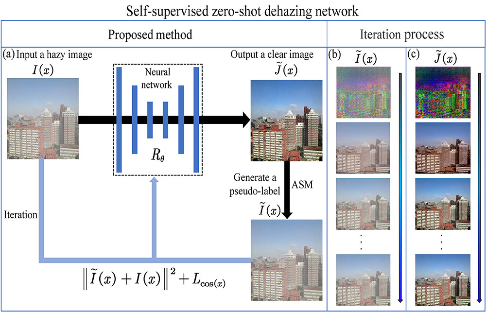 Most learning-based methods previously used in image dehazing employ a supervised learning strategy, which is time-consuming and requires a large-scale dataset. However, large-scale datasets are difficult to obtain. Here, we propose a self-supervised zero-shot dehazing network (SZDNet) based on dark channel prior, which uses a hazy image generated from the output dehazed image as a pseudo-label to supervise the optimization process of the network. Additionally, we use a novel multichannel quad-tree algorithm to estimate atmospheric light values, which is more accurate than previous methods. Furthermore, the sum of the cosine distance and the mean squared error between the pseudo-label and the input image is applied as a loss function to enhance the quality of the dehazed image. The most significant advantage of the SZDNet is that it does not require a large dataset for training before performing the dehazing task. Extensive testing shows promising performances of the proposed method in both qualitative and quantitative evaluations when compared with state-of-the-art methods.