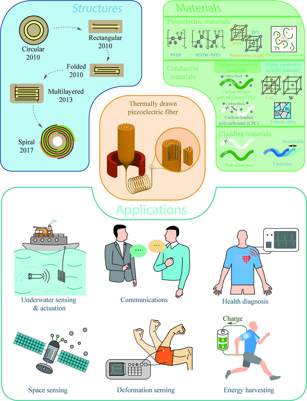 Flexible and wearable electronics represent paramount technologies offering revolutionized solutions for medical diagnosis and therapy, nerve and organ interfaces, fabric computation, robot-in-medicine and metaverse. Being ubiquitous in everyday life, piezoelectric materials and devices play a vital role in flexible and wearable electronics with their intriguing functionalities, including energy harvesting, sensing and actuation, personal health care and communications. As a new emerging flexible and wearable technology, fiber-shaped piezoelectric devices offer unique advantages over conventional thin-film counterparts. In this review, we survey the recent scientific and technological breakthroughs in thermally drawn piezoelectric fibers and fiber-enabled intelligent fabrics. We highlight the fiber materials, fiber architecture, fabrication, device integration as well as functions that deliver higher forms of unique applications across smart sensing, health care, space security, actuation and energy domains. We conclude with a critical analysis of existing challenges and opportunities that will be important for the continued progress of this field.