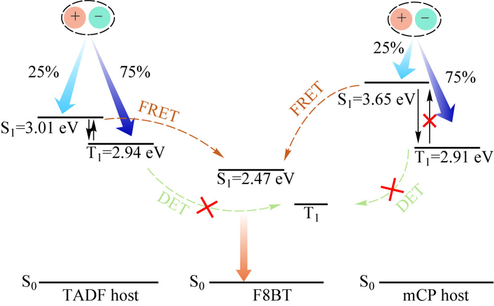 Thermally activated delayed fluorescence (TADF) small molecule bis-[3-(9,9-dimethyl-9,10-dihydroacridine)-phenyl]-sulfone (m-ACSO2) was used as a universal host to sensitize three conventional fluorescent polymers for maximizing the electroluminescent performance. The excitons were utilized via inter-molecular energy transfer and the non-radiative decays were successfully refrained in the condensed states. Therefore, the significant enhancement of the electroluminescent efficiencies was demonstrated. For instance, after doping poly(9,9-dioctylfluorene-co-benzothiadiazole) (F8BT) into m-ACSO2, the external quantum efficiency (EQE) was improved by a factor of 17.0 in the solution-processed organic light-emitting device (OLED), as compared with the device with neat F8BT. In terms of the other well-known fluorescent polymers, i.e., poly (para-phenylene vinylene) copolymer (Super Yellow, SY) and poly[2-methoxy-5-(2-ethylhexyloxy)-1,4-phenylenevinylene] (MEH-PPV), their EQEs in the devices were respectively enhanced by 70% and 270%, compared with the reference devices based on the conventional host 1,3-di(9H-carbazol-9-yl) benzene (mCP). Besides the improved charge balance in the bipolar TADF host, these were partially ascribed to reduced fluorescence quenching in the mixed films.
