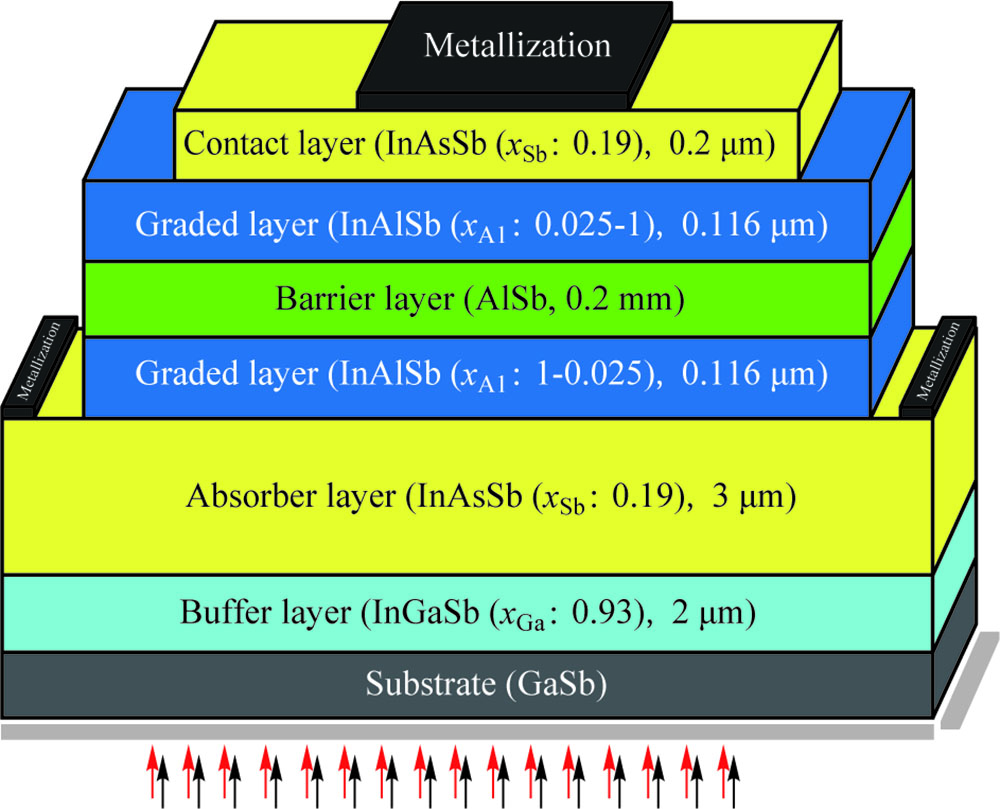 We report a new nBn photodetector (nBn-PD) design based on the InAlSb/AlSb/InAlSb/InAsSb material systems for mid-wavelength infrared (MWIR) applications. In this structure, delta-doped compositionally graded barrier (δ-DCGB) layers are suggested, the advantage of which is creation of a near zero valence band offset in nBn photodetectors. The design of the δ-DCGB nBn-PD device includes a 3 μm absorber layer (n-InAs0.81Sb0.19), a unipolar barrier layer (AlSb), and 0.2 μm contact layer (n-InAs0.81Sb0.19) as well as a 0.116 μm linear grading region (InAlSb) from the contact to the barrier layer and also from the barrier to the absorber layer. The analysis includes various dark current contributions, such as the Shockley–Read–Hall (SRH), trap-assisted tunneling (TAT), Auger, and Radiative recombination mechanisms, to acquire more precise results. Consequently, we show that the method used in the nBn device design leads to diffusion-limited dark current so that the dark current density is 2.596 × 10-8 A/cm2 at 150 K and a bias voltage of - 0.2 V. The proposed nBn detector exhibits a 50% cutoff wavelength of more than 5 μm, the peak current responsivity is 1.6 A/W at a wavelength of 4.5 μm and a - 0.2 V bias with 0.05 W/cm2 backside illumination without anti-reflective coating. The maximum quantum efficiency at 4.5 μm is about 48.6%, and peak specific detectivity (D*) is of 3.37 × 1010 cm·Hz1/2/W. Next, to solve the reflection concern in this nBn devices, we use a BaF2 anti-reflection coating layer due to its high transmittance in the MWIR window. It leads to an increase of almost 100% in the optical response metrics, such as the current responsivity, quantum efficiency, and detectivity, compared to the optical response without an anti-reflection coating layer.