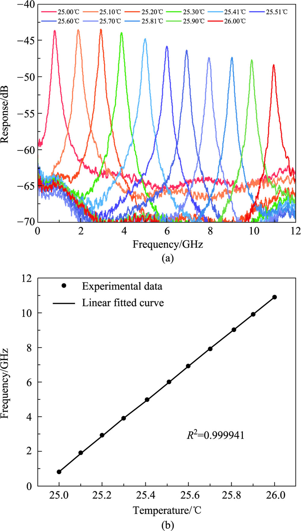 Microwave photonic sensors are promising for improving sensing resolution and speed of optical sensors. In this paper, a high-sensitivity, high-resolution temperature sensor based on microwave photonic filter (MPF) is proposed and demonstrated. A micro-ring resonator (MRR) based on silicon-on-insulator is used as the sensing probe to convert the wavelength shift caused by temperature change to microwave frequency variation via the MPF system. By analyzing the frequency shift with high-speed and high-resolution monitors, the temperature change can be detected. The MRR is designed with multi-mode ridge waveguides to reduce propagation loss and achieves an ultra-high Q factor of 1.01 × 106. The proposed MPF has a single passband with a narrow bandwidth of 192 MHz. With clear peak-frequency shift, the sensitivity of the MPF-based temperature sensor is measured to be 10.22 GHz/℃. Due to higher sensitivity and ultra-narrow bandwidth of the MPF, the sensing resolution of the proposed temperature sensor is as high as 0.019 ℃.