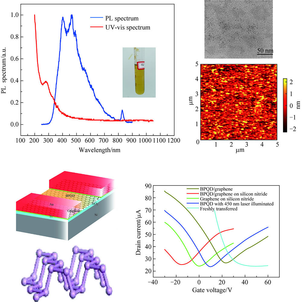 Black phosphorus quantum dots (BPQDs) are synthesized and combined with graphene sheet. The fabricated BPQDs/graphene devices are capable of detecting visible and near infrared radiation. The adsorption effect of BPQDs in graphene is clarified by the relationship of the photocurrent and the shift of the Dirac point with different substrate. The Dirac point moves toward a neutral point under illumination with both SiO2/Si and Si3N4/Si substrates, indicating an anti-doped feature of photo-excitation. To our knowledge, this provides the first observation of photoresist induced photocurrent in such systems. Without the influence of the photoresist the device can respond to infrared light up to 980 nm wavelength in vacuum in a cryostat, in which the photocurrent is positive and photoconduction effect is believed to dominate the photocurrent. Finally, the adsorption effect is modeled using a first-principle method to give a picture of charge transfer and orbital contribution in the interaction of phosphorus atoms and single-layer graphene.