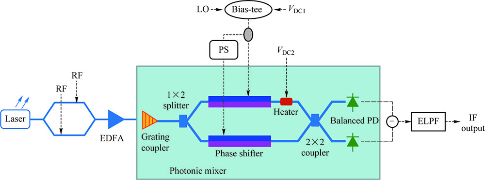 An integrated microwave photonic mixer based on silicon photonic platforms is proposed, which consist of a dual-drive Mach–Zehnder modulator and a balanced photodetector. The modulated optical signals from microwave photonic links can be directly demodulated and down-converted to intermediate frequency (IF) signals by the photonic mixer. The converted signal is obtained by conducting off-chip subtraction of the outputs from the balanced photodetector, and subsequent filtering of the high frequency items by an electrical low-pass filter. Benefiting from balanced detection, the conversion gain of the IF signal is improved by 6 dB, and radio frequency leakage and common-mode noise are suppressed significantly. System-level simulations show that the frequency mixing system has a spurious-free dynamic range of 89 dB·Hz2/3, even with deteriorated linearity caused by the two cascaded modulators. The spur suppression ratio of the photonic mixer remains higher than 40 dB when the IF varies from 0.5 to 4 GHz. The electrical-electrical 3 dB bandwidth of frequency conversion is 11 GHz. The integrated frequency mixing approach is quite simple, requiring no extra optical filters or electrical 90° hybrid coupler, which makes the system more stable and with broader bandwidth so that it can meet the potential demand in practical applications.