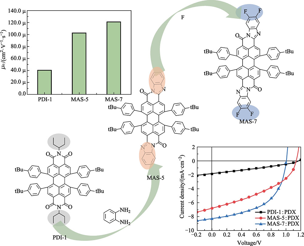 Download coverSingle perylene diimide (PDI) used as a non-fullerene acceptor (NFA) in organic solar cells (OSCs) is enticing because of its low cost and excellent stability. To improve the photovoltaic performance, it is vital to narrow the bandgap and regulate the stacking behavior. To address this challenge, we synthesize soluble perylenetetracarboxylic bisbenzimidazole (PTCBI) molecules with a bulky side chain at the bay region, by replacing the widely used “swallow tail” type alkyl chains at the imide position of PDI molecules with a planar benzimidazole structure. Compared with PDI molecules, PTCBI molecules exhibit red-shifted UV–vis absorption spectra with larger extinction coefficient, and one magnitude higher electron mobility. Finally, OSCs based on one soluble PTCBI-type NFA, namely MAS-7, exhibit a champion power conversion efficiency (PCE) of 4.34%, which is significantly higher than that of the corresponding PDI-based OSCs and is the highest PCE of PTCBI-based OSCs reported. These results highlight the potential of soluble PTCBI derivatives as NFAs in OSCs.