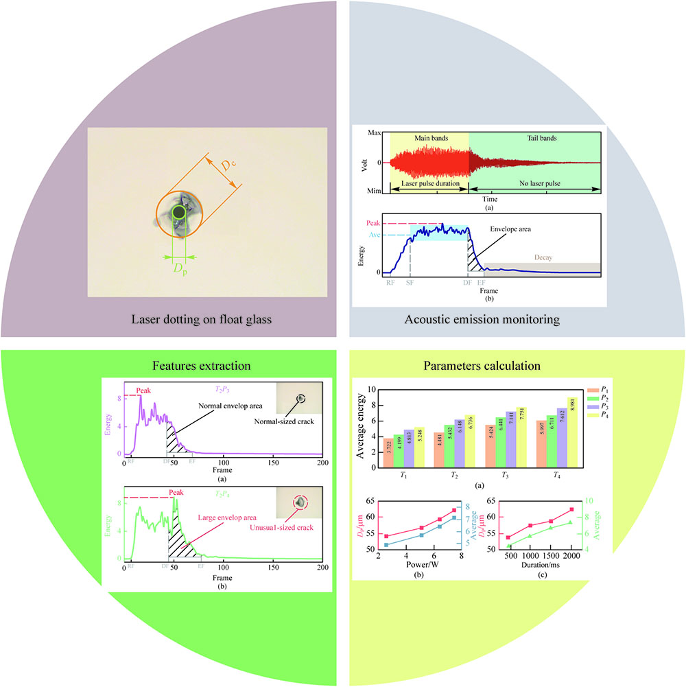 The mechanisms of interaction between pulsed laser and materials are complex and indistinct, severely influencing the stability and quality of laser processing. This paper proposes an intelligent method based on the acoustic emission (AE) technique to monitor laser processing and explore the interaction mechanisms. The validation experiment is designed to perform nanosecond laser dotting on float glass. Processing parameters are set differently to generate various outcomes: ablated pits and irregular-shaped cracks. In the signal processing stage, we divide the AE signals into two bands, main and tail bands, according to the laser processing duration, to study the laser ablation and crack behavior, respectively. Characteristic parameters extracted by a method that combines framework and frame energy calculation of AE signals can effectively reveal the mechanisms of pulsed laser processing. The main band features evaluate the degree of laser ablation from the time and intensity scales, and the tail band characteristics demonstrate that the cracks occur after laser dotting. In addition, from the analysis of the parameters of the tail band very large cracks can be efficiently distinguished. The intelligent AE monitoring method was successfully applied in exploring the interaction mechanism of nanosecond laser dotting float glass and can be used in other pulsed laser processing fields.
