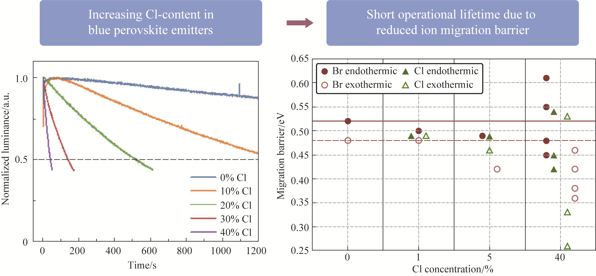 Although perovskite light-emitting diodes (PeLEDs) have seen unprecedented development in device efficiency over the past decade, they suffer significantly from poor operational stability. This is especially true for blue PeLEDs, whose operational lifetime remains orders of magnitude behind their green and red counterparts. Here, we systematically investigate this efficiency-stability discrepancy in a series of green- to blue-emitting PeLEDs based on mixed Br/Cl-perovskites. We find that chloride incorporation, while having only a limited impact on efficiency, detrimentally affects device stability even in small amounts. Device lifetime drops exponentially with increasing Cl-content, accompanied by an increased rate of change in electrical properties during operation. We ascribe this phenomenon to an increased mobility of halogen ions in the mixed-halide lattice due to an increased chemically and structurally disordered landscape with reduced migration barriers. Our results indicate that the stability enhancement for PeLEDs might require different strategies from those used for improving efficiency.