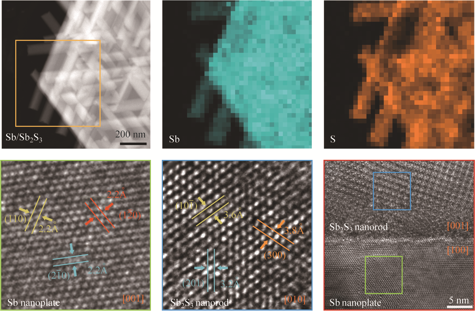Multi-dimensional heterojunction materials have attracted much attention due to their intriguing properties, such as high efficiency, wide band gap regulation, low dimensional limitation, versatility and scalability. To further improve the performance of materials, researchers have combined materials with various dimensions using a wide variety of techniques. However, research on growth mechanism of such composite materials is still lacking. In this paper, the growth mechanism of multidimensional heterojunction composite material is studied using quasi-two-dimensional (quasi-2D) antimonene and quasione-dimensional (quasi-1D) antimony sulfide as examples. These are synthesized by a simple thermal injection method. It is observed that the consequent nanorods are oriented along six-fold symmetric directions on the nanoplate, forming ordered quasi-1D/quasi-2D heterostructures. Comprehensive transmission electron microscopy (TEM) characterizations confirm the chemical information and reveal orientational relationship between Sb2S3 nanorods and the Sb nanoplate as substrate. Further density functional theory calculations indicate that interfacial binding energy is the primary deciding factor for the self-assembly of ordered structures. These details may fill the gaps in the research on multi-dimensional composite materials with ordered structures, and promote their future versatile applications.