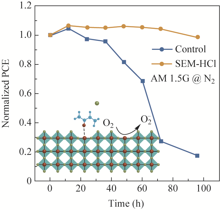 Tin perovskites with exemplary optoelectronic properties offer potential application in lead-free perovskite solar cells. However, Sn vacancies and undercoordinated Sn ions on the tin perovskite surfaces can create deep-level traps, leading to non-radiative recombination and absorption of nucleophilic O2 molecules, impeding further device efficiency and stability. Here, in this study, a new additive of semicarbazide hydrochloride (SEM-HCl) with a N–C=O functional group was introduced into the perovskite precursor to fabricate high-quality films with a low concentration of deep-level trap densities. This, in turn, serves to prevent undesirable interaction between photogenerated carriers and adsorbed oxygen molecules in the device’s operational environment, ultimately reducing the proliferation of superoxide entities. As the result, the SEM-HCl-derived devices show a peak efficiency of 10.9% with improved device stability. These unencapsulated devices maintain almost 100% of their initial efficiencies after working for 100 h under continuous AM1.5 illumination conditions.