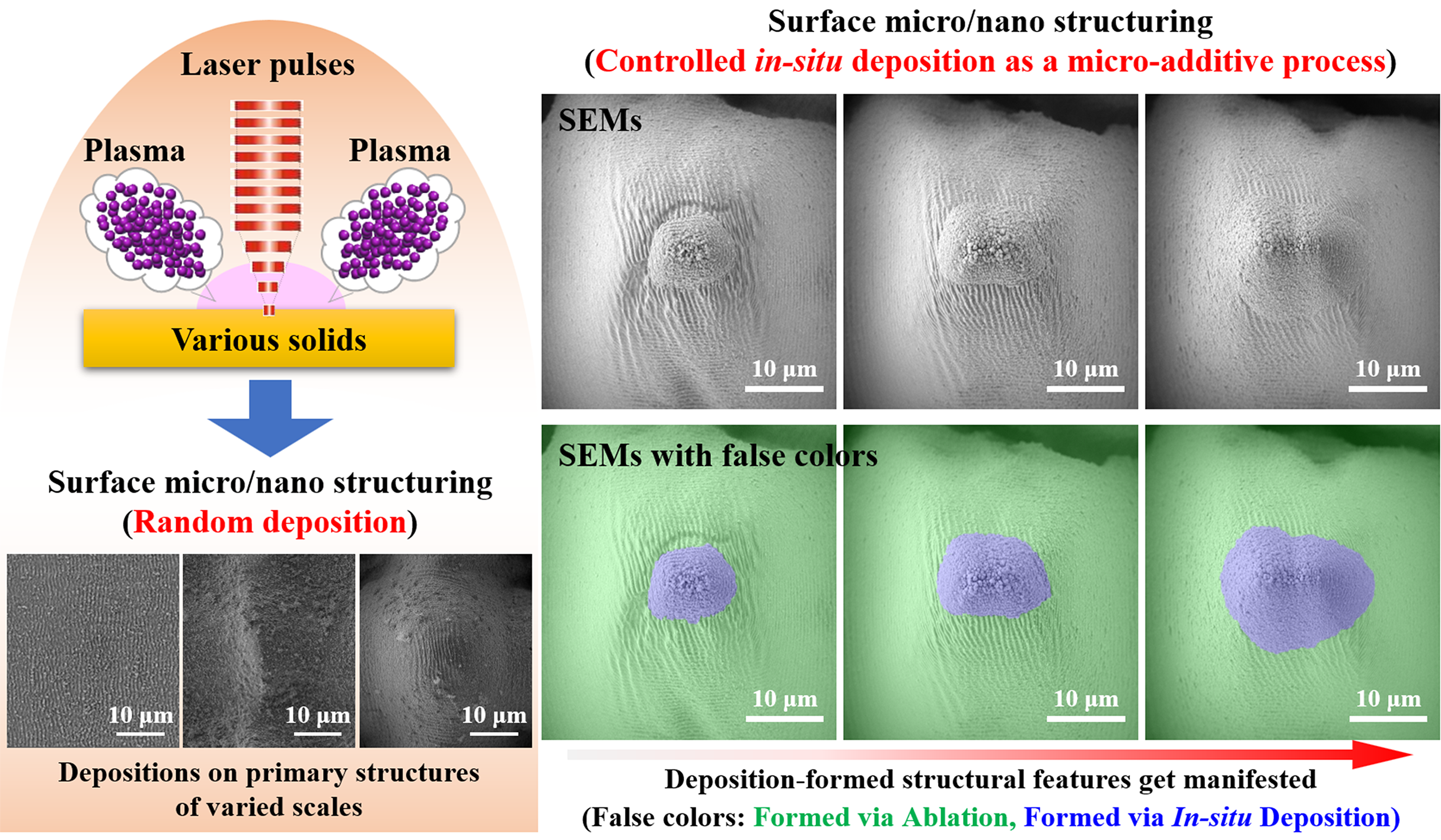 Controllable fabrication of surface micro/nano structures is the key to realizing surface functionalization for various applications. As a versatile approach, ultrafast laser ablation has been widely studied for surface micro/nano structuring. Increasing research efforts in this field have been devoted to gaining more control over the fabrication processes to meet the increasing need for creation of complex structures. In this paper, we focus on the in-situ deposition process following the plasma formation under ultrafast laser ablation. From an overview perspective, we firstly summarize the different roles that plasma plumes, from pulsed laser ablation of solids, play in different laser processing approaches. Then, the distinctive in-situ deposition process within surface micro/nano structuring is highlighted. Our experimental work demonstrated that the in-situ deposition during ultrafast laser surface structuring can be controlled as a localized micro-additive process to pile up secondary ordered structures, through which a unique kind of hierarchical structure with fort-like bodies sitting on top of micro cone arrays were fabricated as a showcase. The revealed laser-matter interaction mechanism can be inspiring for the development of new ultrafast laser fabrication approaches, adding a new dimension and more flexibility in controlling the fabrication of functional surface micro/nano structures.
