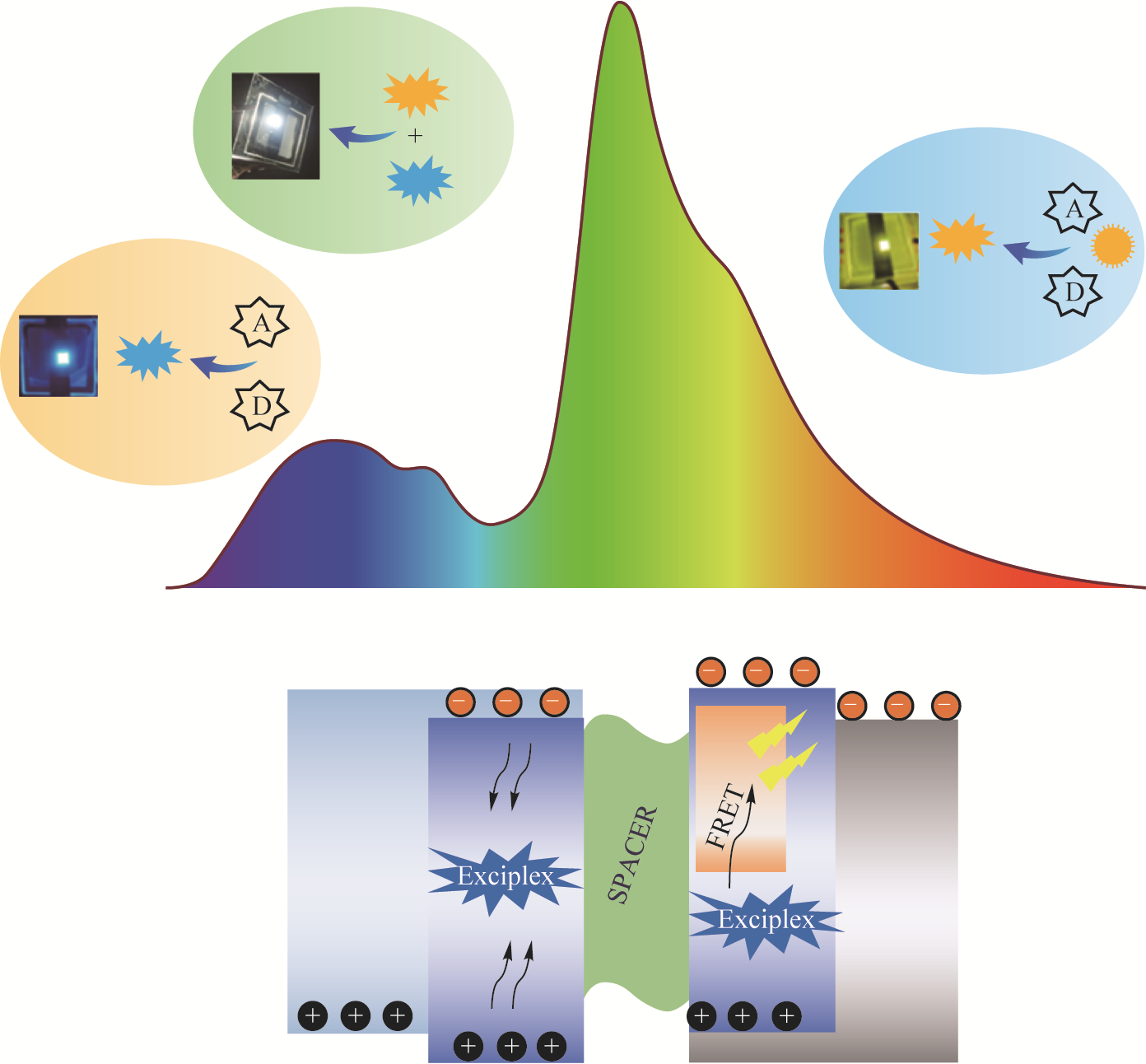 White organic light-emitting diodes (WOLEDs) have several desirable features, but their commercialization is hindered by the poor stability of blue light emitters and high production costs due to complicated device structures. Herein, we investigate a standard blue emitting hole transporting material (HTM) N,N'-bis(naphthalen-1-yl)-N,N'-bis(phenyl)benzidine (NPB) and its exciplex emission upon combining with a suitable electron transporting material (ETM), 3-(biphenyl-4-yl)-5-(4-tert-butylphenyl)-4-phenyl-4H-1,2,4-triazole (TAZ). Blue and yellow OLEDs with simple device structures are developed by using a blend layer, NPB:TAZ, as a blue emitter as well as a host for yellow phosphorescent dopant iridium (Ⅲ) bis(4-phenylthieno[3,2-c]pyridinato-N,C2')acetylacetonate (PO-01). Strategic device design then exploits the ambipolar charge transport properties of tetracene as a spacer layer to connect these blue and yellow emitting units. The tetracene-linked device demonstrates more promising results compared to those using a conventional charge generation layer (CGL). Judicious choice of the spacer prevents exciton diffusion from the blue emitter unit, yet facilitates charge carrier transport to the yellow emitter unit to enable additional exciplex formation. This complementary behavior of the spacer improves the blue emission properties concomitantly yielding reasonable yellow emission. The overall white light emission properties are enhanced, achieving CIE coordinates (0.36, 0.39) and color temperature (4643 K) similar to daylight. Employing intermolecular exciplex emission in OLEDs simplifies the device architecture via its dual functionality as a host and as an emitter.