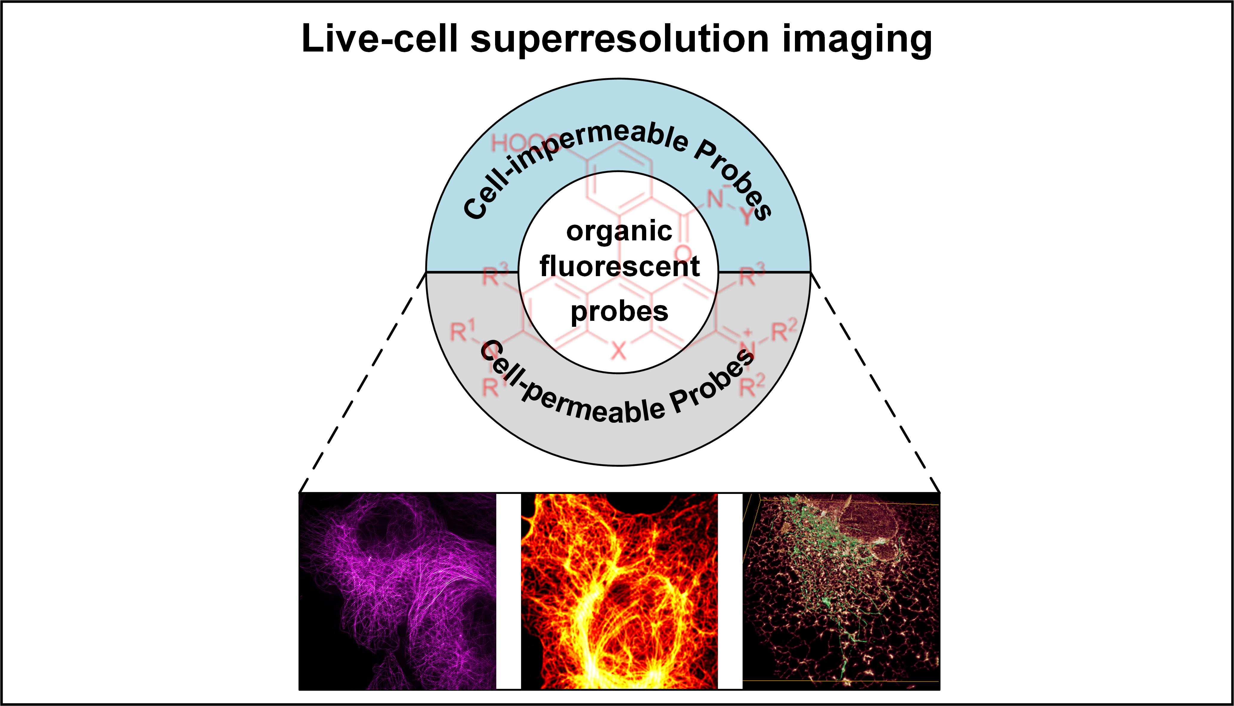 The development of super-resolution technology has made it possible to investigate the ultrastructure of intracellular organelles by fluorescence microscopy, which has greatly facilitated the development of life sciences and biomedicine. To realize super-resolution imaging of living cells, both advanced imaging systems and excellent fluorescent probes are required. Traditional fluorescent probes have good availability, but that is not the case for probes for live-cell super-resolution imaging. In this review, we first introduce the principles of various super-resolution technologies and their probe requirements, then summarize the existing designs and delivery strategies of super-resolution probes for live-cell imaging, and finally provide a brief conclusion and overview of the future.