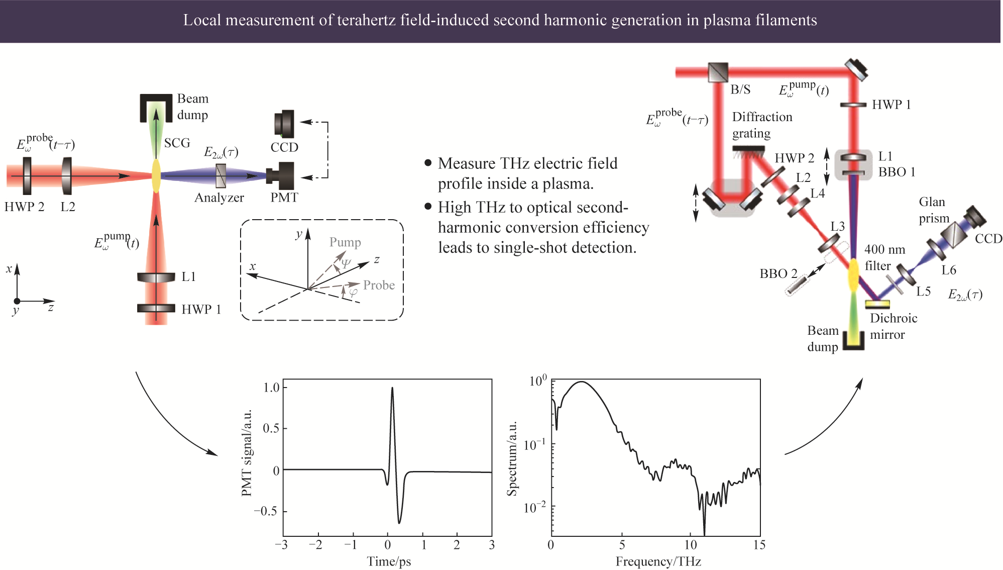 The concept of Terahertz Field-Induced Second Harmonic (TFISH) Generation is revisited to introduce a single-shot detection scheme based on third order nonlinearities. Focused specifically on the further development of THz plasma-based sources, we begin our research by reimagining the TFISH system to serve as a direct plasma diagnostic. In this work, an optical probe beam is used to mix directly with the strong ponderomotive current associated with laser-induced ionization. A four-wave mixing (FWM) process then generates a strong second-harmonic optical wave because of the mixing of the probe beam with the nonlinear current components oscillating at THz frequencies. The observed conversion efficiency is high enough that for the first time, the TFISH signal appears visible to the human eye. We perform spectral, spatial, and temporal analysis on the detected second-harmonic frequency and show its direct relationship to the nonlinear current. Further, a method to detect incoherent and coherent THz inside plasma filaments is devised using spatio-temporal couplings. The single-shot detection configurations are theoretically described using a combination of expanded FWM models with Kostenbauder and Gaussian Q-matrices. We show that the retrieved temporal traces for THz radiation from single- and twocolor laser-induced air-plasma sources match theoretical descriptions very well. High temporal resolution is shown with a detection bandwidth limited only by the spatial extent of the probe laser beam. Large detection bandwidth and temporal characterization is shown for THz radiation confined to under-dense plasma filaments induced by < 100 fs lasers below the relativistic intensity limit.