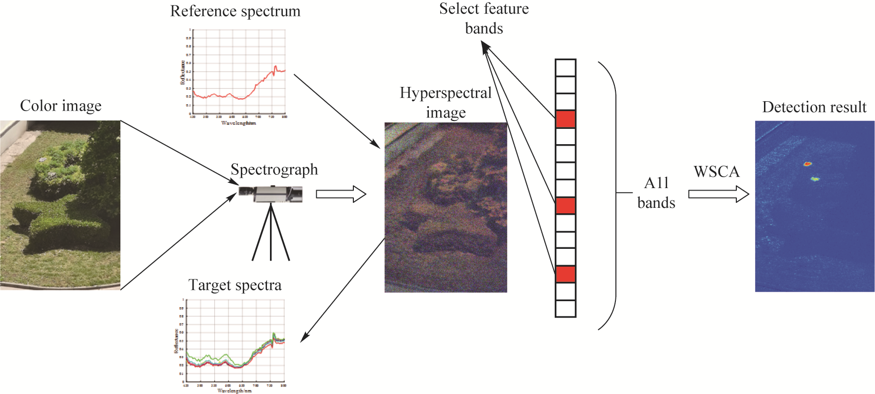 In land-based spectral imaging, the spectra of ground objects are inevitably affected by the imaging conditions (weather conditions, atmospheric conditions, light conditions, zenith and azimuth angle conditions) and spatial distribution of targets, leading to uncertainties featured by “same object different spectrum”. That is, the spectrum of a ground object may change within a certain range under different imaging conditions. Traditional target detection (TD) methods are mainly based on similarity measurements and do not fully account for the spectral uncertainties. These detection methods are prone to false detections or missed detections. Therefore, reducing the impact of spectral uncertainties on TD is an important research topic in hyperspectral imaging. In this paper, we first review traditional TD methods and compare their principles and characteristics. It is found that the spectral correlation angle (SCA) method has good adaptability in land-based imaging. The shortcoming of the SCA method that it cannot reflect the local spectrum characteristics, is also analyzed. As the effect of spectral uncertainties cannot be completely overcome by the SCA method, a new similarity measurement method, the weighted spectral correlation angle (WSCA) method, is proposed. It can reduce the influence of spectral uncertainties on TD by increasing the weight of particular bands. Finally, we use two sets of experiments to analyze the effect of the WSCA method on TD. Its performance in overcoming spectral uncertainties caused by variations in imaging conditions or uneven spatial distributions of targets is tested. The results show that the WSCA method can effectively reduce the influence of spectral uncertainties and obtain a good detection result.