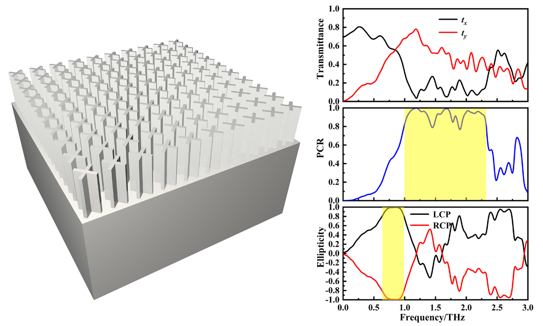Polarization, a fundamental behavior of electromagnetic waves, holds immense potential across diverse domains such as environmental monitoring, biomedicine, and ocean exploration. However, achieving efficient modulation of terahertz waves with wide operational bandwidth poses significant challenges. Here, we introduce an all-silicon polarization converter designed specifically to operate in the terahertz range of the electromagnetic spectrum. Simulation results demonstrate that the average conversion efficiency of cross-linear waves exceeds 80% across a wide frequency range spanning from 1.00 to 2.32 THz, with the highest conversion efficiency peaking at an impressive 99.97%. Additionally, our proposed structure facilitates linear-to-circular polarization conversion with an ellipticity of 1 at 0.85 THz. Furthermore, by rotating the cross-shaped microstructure, active control over arbitrary polarization states can be achieved. To summarize, the proposed structure offers remarkable flexibility and ease of integration, providing a reliable and practical solution for achieving broadband and efficient polarization conversion of terahertz waves.