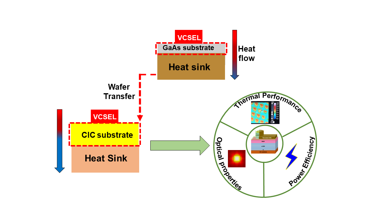Thin film p-side up vertical-cavity surface-emitting lasers (VCSELs) with 940 nm wavelength on a composite metal (Copper/Invar/Copper; CIC) substrate has been demonstrated by twice-bonding transfer and substrate removing techniques. The CIC substrate is a sandwich structure with a 10 µm thick Copper (Cu) layer/30 µm thick Invar layer/10 µm thick Cu layer. The Invar layer was composed of Iron (Fe) and Nickel (Ni) with a proportion of 70:30. The thermal expansion coefficient of the composite CIC metal can match that of the GaAs substrate. It results that the VCSEL layers can be successfully transferred to CIC metal substrate without cracking. At 1 mA current, the top-emitting VCSEL/GaAs and thin-film VCSEL/CIC had a voltage of 1.39 and 1.37 V, respectively. The optical output powers of VCSEL/GaAs and VCSEL/CIC were 21.91 and 24.40 mW, respectively. The 50 µm thick CIC substrate can play a good heat dissipation function, which results in improving the electrical and optical characteristics of thin film VCSELs/CIC. The VCSEL/CIC exhibited a superior thermal management capability as compared with VCSEL/GaAs. The obtained data suggested that VCSELs on a composite metal substrate not only affected significantly the characteristics of thin film VCSEL, but also improved considerably the device thermal performance.