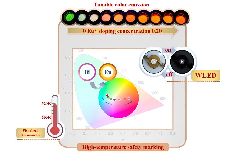 A series of Bi3+/Eu3+ co-doped Ca2Ta2O7 (CTO:Bi3+/Eu3+) phosphors were prepared by high-temperature solid-state method for dual-emission center optical thermometers and white light-emitting diode (WLED) device. By modulating the doping ratio of Bi3+/Eu3+ and utilizing the energy transfer from Bi3+ to Eu3+, the tunable color emission ranging from green to reddish-orange was realized. The designed CTO:0.04Bi3+/Eu3+ optical thermometers exhibit significant thermochromism, superior stability, and repeatability, with maximum sensitivities of Sa = 0.055 K-1 (at 510 K) and Sr = 1.298% K-1 (at 480 K) within the temperature range of 300–510 K, owing to the different thermal quenching behaviors between Bi3+ and Eu3+ ions. These features indicate the potential application prospects of the prepared samples in visualized thermometer or high-temperature safety marking. Furthermore, leveraging the excellent zero-thermal-quenching performance, outstanding acid/alkali resistance, and color stability of CTO:0.04Bi3+/0.16Eu3+ phosphor, a WLED device with a high Ra value of 95.3 has been realized through its combination with commercially available blue and green phosphors, thereby demonstrating the potential application of CTO:0.04Bi3+/0.16Eu3+ in near-UV pumped WLED devices.