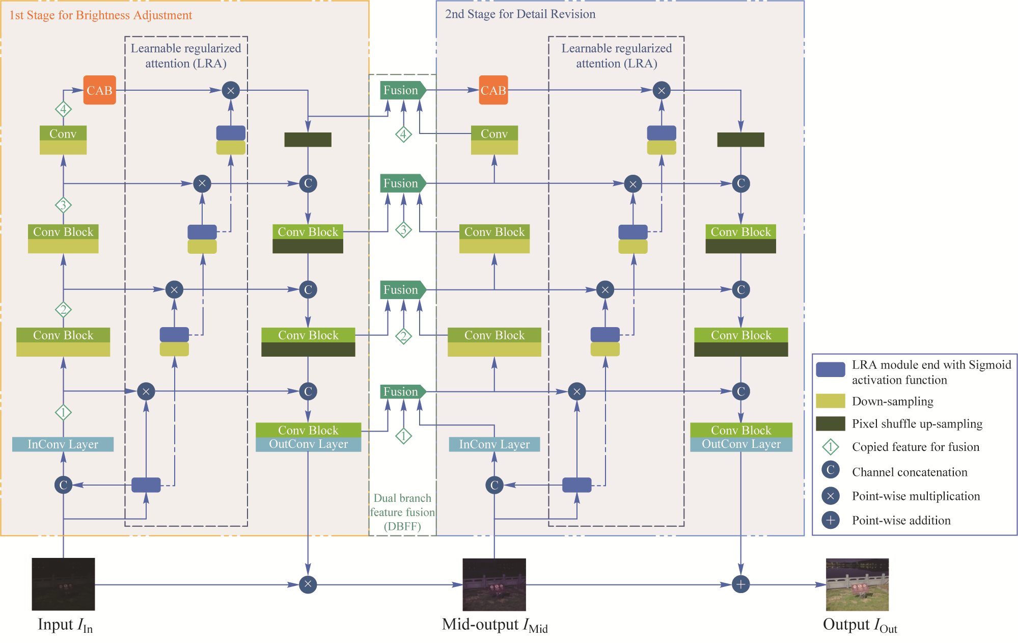 Restricted by the lighting conditions, the images captured at night tend to suffer from color aberration, noise, and other unfavorable factors, making it difficult for subsequent vision-based applications. To solve this problem, we propose a two-stage size-controllable low-light enhancement method, named Dual Fusion Enhancement Net (DFEN). The whole algorithm is built on a double U-Net structure, implementing brightness adjustment and detail revision respectively. A dual branch feature fusion module is adopted to enhance its ability of feature extraction and aggregation. We also design a learnable regularized attention module to balance the enhancement effect on different regions. Besides, we introduce a cosine training strategy to smooth the transition of the training target from the brightness adjustment stage to the detail revision stage during the training process. The proposed DFEN is tested on several low-light datasets, and the experimental results demonstrate that the algorithm achieves superior enhancement results with the similar parameters. It is worth noting that the lightest DFEN model reaches 11 FPS for image size of 1224×1024 in an RTX 3090 GPU.
