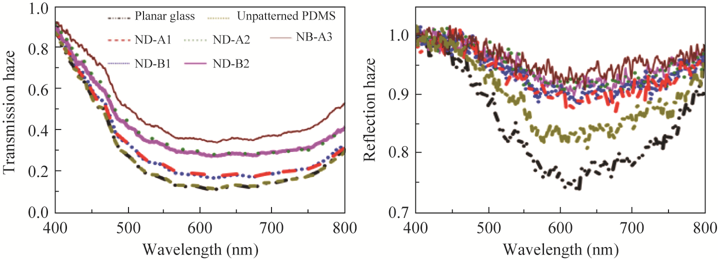 Cost-effective soft imprint lithography technique is used to prepare flexible thin polymeric surfaces containing a periodic arrangement of nanodimples and nanobumps of sub-micron size. Using a single master mold of self-assembled colloidal crystal, metasurfaces with different depths and heights of patterns with a fixed pitch are possible, which makes the process inexpensive and simple. These metasurfaces are studied for their diffuse and total transmission and reflection spectra in the visible range. The transmission haze and reflection haze are calculated from the measurements. The surface containing nanobumps of lesser pattern height result in higher values of reflection and transmission haze than from surfaces containing nanodimples of much higher depth for the same pitch. The haze is more dependent on the pattern depth or height and less dependent on the pitch of the pattern. Far-field transmission profiles measured in the same wavelength range from the patterned surfaces show that the scattering increases with the increase of the ratio of pattern depth/height to pitch, similar to the haze measurements conducted with a closed integrating sphere. These profiles show that the angular spread of scattered light in transmission is within 10°, explaining the reason for the relatively low transmission haze in all the patterned surfaces. Simulation results confirm that the nanobump pattern gives higher transmission haze compared to nanodimple pattern. By controlling the ratio of pattern depth/height to pitch of the features on these surfaces, both an increase in optical haze and a balance between total reflection intensity and total transmission intensity can be achieved.
