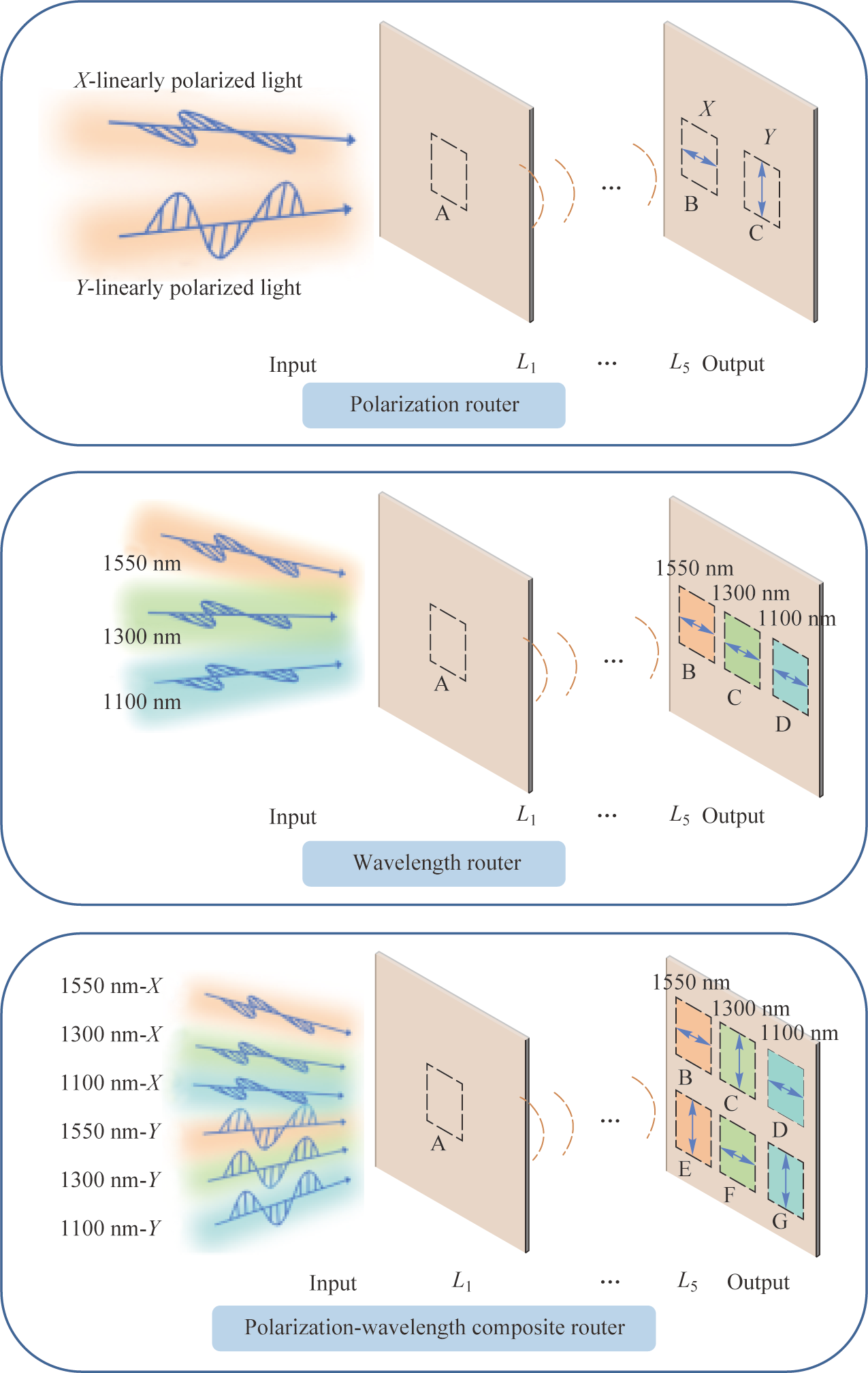 In the field of information processing, all-optical routers are significant for achieving high-speed, high-capacity signal processing and transmission. In this study, we developed three types of structurally simple and flexible routers using the deep diffractive neural network (D2NN), capable of routing incident light based on wavelength and polarization. First, we implemented a polarization router for routing two orthogonally polarized light beams. The second type is the wavelength router that can route light with wavelengths of 1550, 1300, and 1100 nm, demonstrating outstanding performance with insertion loss as low as 0.013 dB and an extinction ratio of up to 18.96 dB, while also maintaining excellent polarization preservation. The final router is the polarization-wavelength composite router, capable of routing six types of input light formed by pairwise combinations of three wavelengths (1550, 1300, and 1100 nm) and two orthogonal linearly polarized lights, thereby enhancing the information processing capability of the device. These devices feature compact structures, maintaining high contrast while exhibiting low loss and passive characteristics, making them suitable for integration into future optical components. This study introduces new avenues and methodologies to enhance performance and broaden the applications of future optical information processing systems.