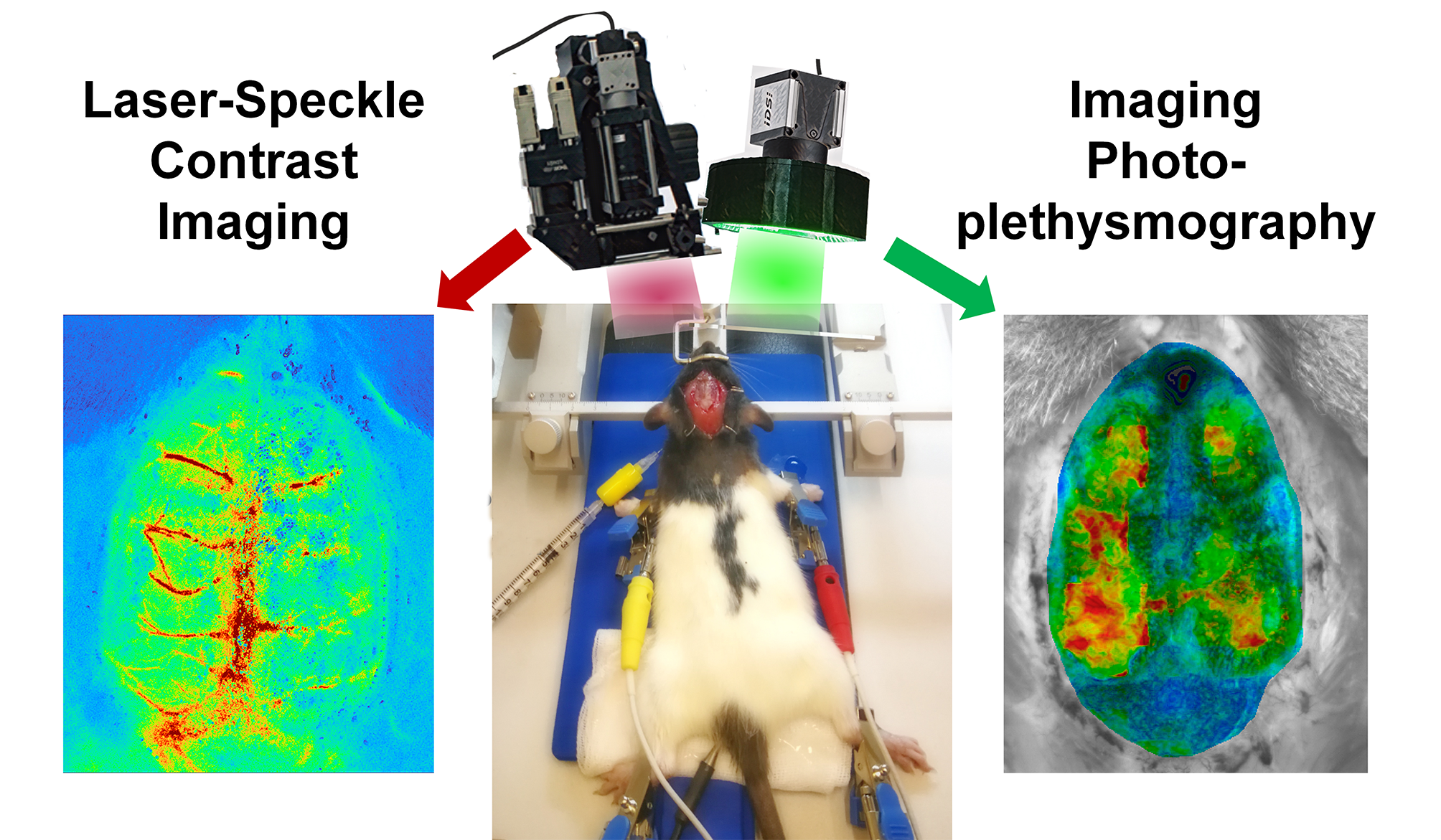 Intraoperative assessment of cerebral hemodynamics is crucial for the success of neurosurgical interventions. This study evaluates the potential of laser speckle contrast imaging (LSCI) and imaging photoplethysmography (IPPG) for contactless perfusion monitoring during neurosurgery. Despite similarities in their hardware requirements, these techniques rely on fundamentally different principles: light scattering for LSCI and light absorption for IPPG. Comparative experiments were conducted using animals (rats) when assessing the reaction of cerebral hemodynamics to adenosine triphosphate infusion. The results show different spatial and temporal characteristics of the techniques: LSCI predominantly visualizes blood flow in large venous vessels, especially in the sagittal and transverse sinuses, showing a pronounced modulation associated with the heart that cannot be explained by venous blood flow alone. In contrast, IPPG quantifies the dynamics of perfusion changes in the parenchyma, showing minimal signal in large venous vessels. We propose that LSCI signal modulation is significantly influenced by the movement of vessel walls in response to mechanical pressure waves propagating through the parenchyma from nearby arteries. A novel algorithm for LSCI data processing was developed based on this interpretation, producing perfusion indices that align well with IPPG measurements. This study demonstrates that the complementary nature of these techniques (LSCI is sensitive to blood cells displacements, while IPPG detects a change in their density) makes their combined application particularly valuable for comprehensive assessment of cerebral hemodynamics during neurosurgery.