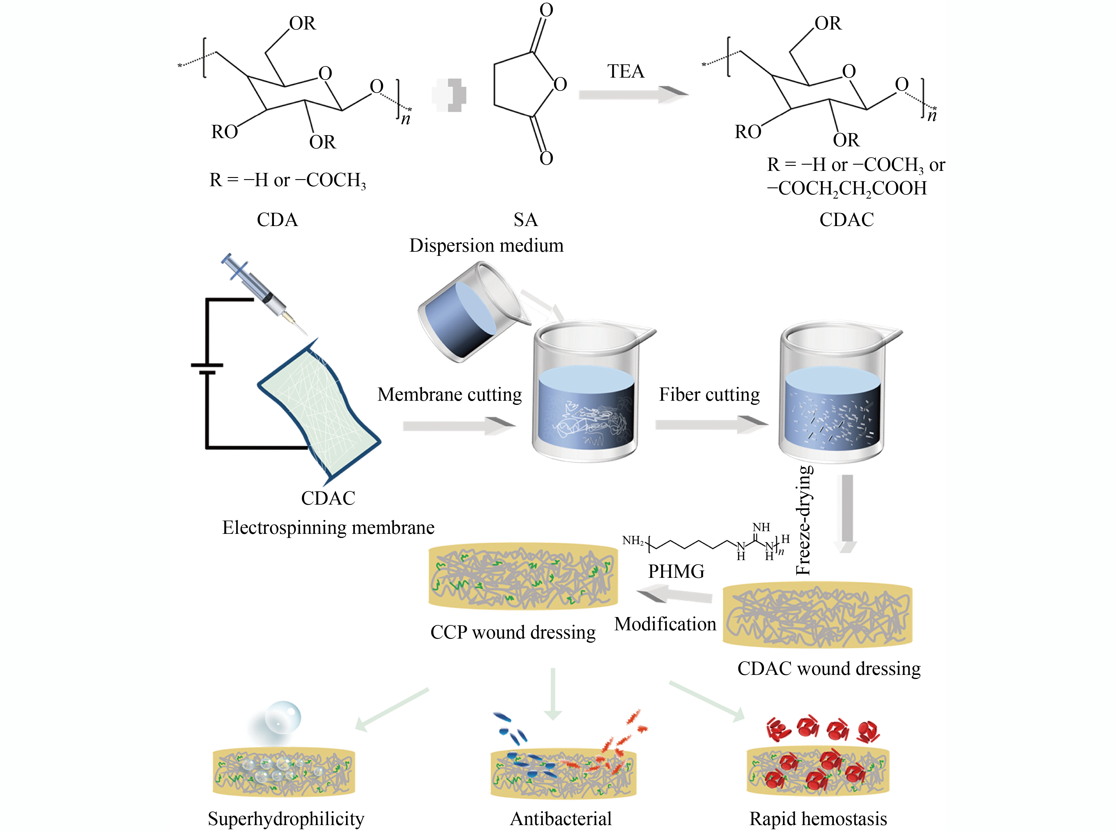 Managing wounds is a growing universal problem and developing effective wound dressings to staunch bleeding and protect wounds from bacterial infections is an increasingly serious challenge. In this work, a remolding electrospinning nanofiber three-dimensional structure wound dressing (CCP) was prepared with superhydrophilicity, high water absorption and absorbing capacity, excellent hemostatic capacity and antibacterial ability, and biocompatibility to promote wound healing. Polyhexamethylene guanidine hydrochloride (PHMG) was grafted to cellulose diacetate (CDA) wound dressing surface through an amide reaction. A water contact angle analysis demonstrated that CCP wound dressing could be beneficial to promote wound exudate management effectively with rapid absorption of water within 0.2 s. In vitro hemo- and cytocompatibility assay showed that a CCP wound dressing had no significant hemotoxicity or cytoxicity. Specifically, CCP wound dressings could be beneficial to accelerate wound hemostasis and further reduce mortality caused by uncontrolled bleeding. Furthermore, CCP wound dressings have an excellent antibacterial ability, which could be beneficial to inhibit wound inflammatory over-reaction and promote normal wound healing. Combined together, the prepared wound dressing in this research effort is expected to have high-potential in clinical applications.