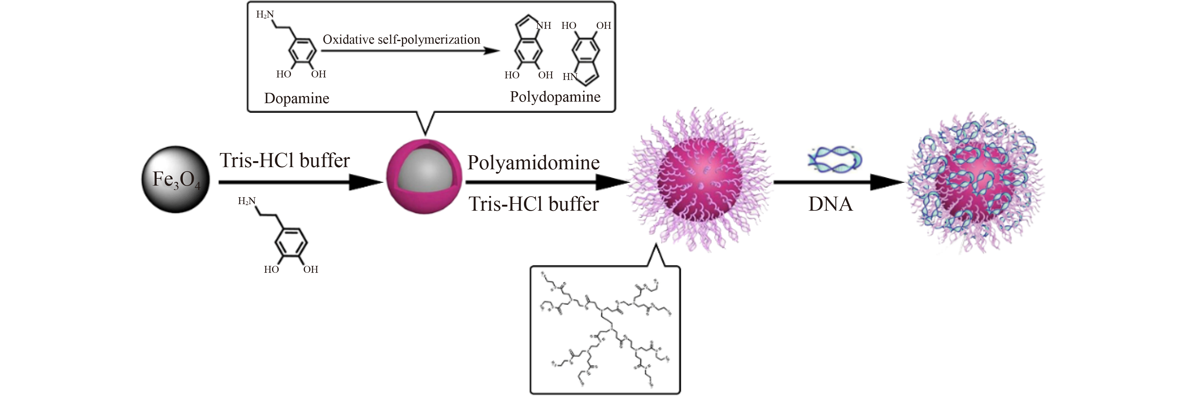 Fe3O4 nanoparticles (NPs) are widely used in the construction of drug and gene delivery vectors because of their particular physicochemical properties. Surface modification can not only reduce the cytotoxicity of Fe3O4, but also further improve the biocompatibility and delivery efficiency. In this work, firstly, polydopamine (PDA)-coated Fe3O4 NPs (named Fe3O4@PDA) were prepared by using the self-polymerization characteristics of dopamine in alkaline environment. Then, polyamidoamine (PAMAM) was modified by the Michael addition reaction to prepare water-soluble core‒shell magnetic NPs of Fe3O4@PDA@PAMAM, and its potential as gene vector was further evaluated. The results revealed that Fe3O4@PDA@PAMAM had the ability to condense and protect DNA, and showed lower cytotoxicity, higher cell uptake and transfection efficiency than those of PAMAM. It has the potential to become a magnetic targeted gene vector for further study.