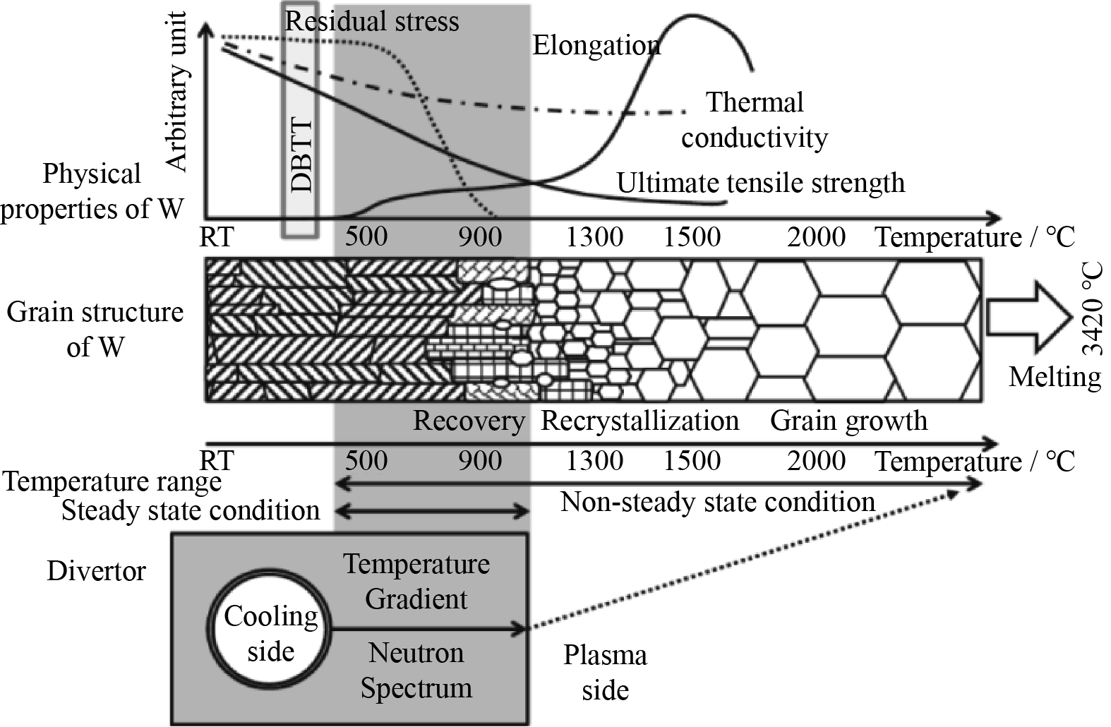 Tungsten (W) has become the most promising plasma-facing material (PFM) in fusion reactor, and W still faces performance degradation caused by low-temperature brittleness, low recrystallization temperature, neutron irradiation effects, and plasma irradiation effects. The modification of W/W-based materials in terms of microstructure manipulation is needed, and such techniques to improve the performance of materials are the topics of hot research. Researchers have found that refining the grain can significantly improve the strength and the irradiation resistance of W/W-based materials. In this paper, novel approaches and technique routes, including the “bottom-up” powder metallurgy method and “top-down” severe plastic deformation method, are introduced to the fabrication of nanocrystalline W/W-based materials. The formation mechanisms of nanocrystalline W/W-based materials were revealed, and the nanostructure stabilization mechanisms were introduced. The mechanical properties of nanocrystalline W/W-based materials were tested, and the irradiation behaviors and performances were studied. The mechanisms of their high mechanical properties and excellent irradiation-damage resistance were illustrated. This article may provide an experimental and theoretical basis for the design and development of high-performance novel nanocrystalline W/W-based materials.