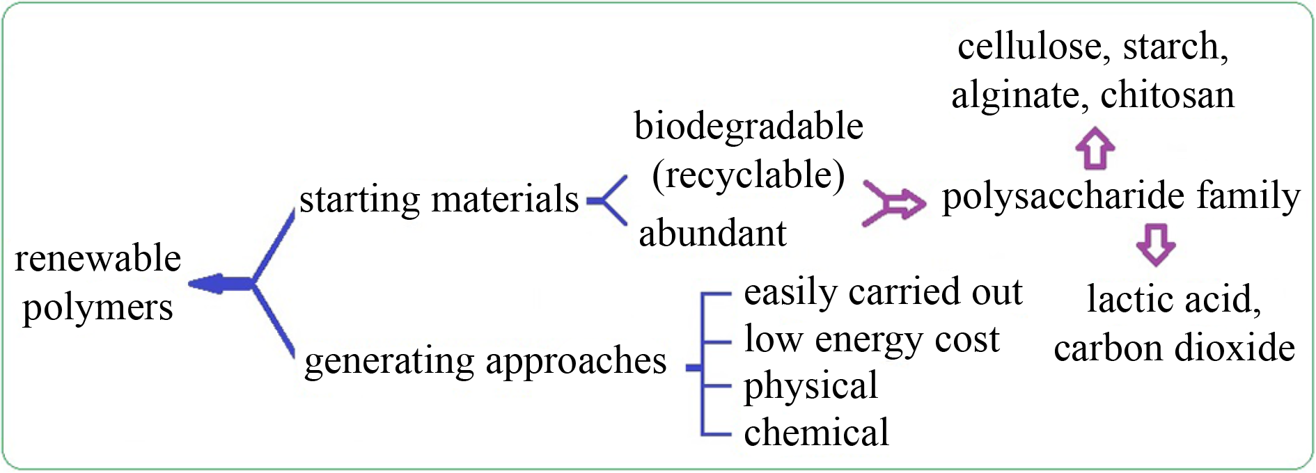 A unique family of renewable polymers has been constructed through facile chemical and physical approaches. In viewing of the abundant and renewable characteristics of starch, cellulose, chitosan and alginate, they are adopted as starting materials. Lactic acid and carbon dioxide, which can be regarded as derivates of starch, are also adopted as starting materials since both of them are abundant, non-toxic and renewable. For sake of making the intension to be carried out easily, the applied chemical or physical approaches are as facile as possible. After two decades of effort, a variety of polymers with versatile properties such as improved mechanical strength, good adsorption or loading capacity and various intelligent behaviors have been tailor-made. These polymers are designed systematically instead of obtaining at random. Herein, our ideas and the strategies for developing the polysaccharide-based renewable polymers are elucidated. It is expected that what presented in this article could stimulate more ideas to develop renewable polymers and bring brighter prospect of the polysaccharide-family.