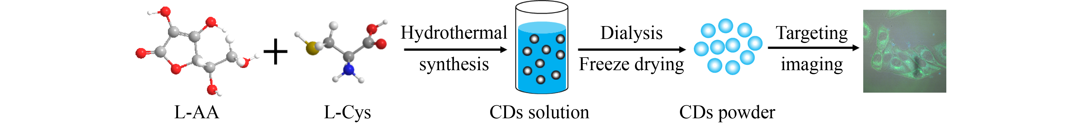The Golgi apparatus is one of the important organelles, where the final processing and packaging of cellular secretions (such as proteins) are completed. The disorder of Golgi apparatus structure and function will induce many diseases. Therefore, monitoring the morphological structure of Golgi apparatus is crucial for the diagnosis and treatment of relevant diseases. In order to achieve Golgi apparatus-targeting imaging, the strategy of targeting unit inheritance was adopted and carbon dots (CDs) with Golgi apparatus-targeting ability were synthesized by one-step hydrothermal method with L-ascorbic acid with high reactivity and reducibility as the carbon source and L-cysteine as the targeting unit. CDs have a certain amount of cysteine residues on their surface, and have excitation dependence, satisfactory fluorescence and cysteine residues stability and low toxicity. As an imaging agent, CDs can be used for targeting imaging of Golgi apparatus.