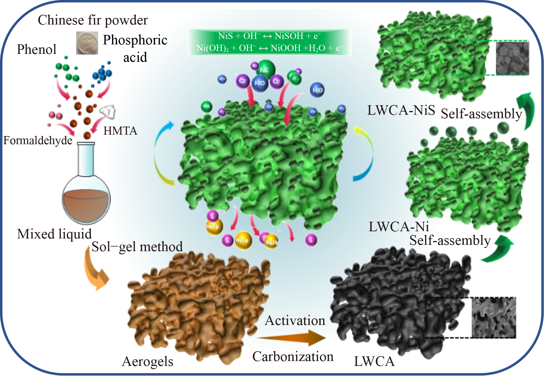 Carbon aerogels derived from biomass have low specific capacity due to the underutilized structure, limiting their application in high-performance supercapacitors. In this work, the hierarchical nickel sulfide/carbon aerogels from liquefied wood (LWCA-NiS) were synthesized via a simple two-step hydrothermal method. Benefitting from the unique 3D coral-like network structure of LWCA, self-assembled NiS nanowires with the dandelion-like structure showed high specific surface (389.1 m2·g−1) and hierarchical pore structure, which increased affluent exposure of numerous active sites and structural stability, causing superior energy storage performance. As expected, LWCA-NiS displayed high specific capacity (131.5 mAh·g−1 at 1 A·g−1), good rate performance, and highly reversible and excellent cycle stability (13.1% capacity fading after 5000 cycles) in the electrochemical test. Furthermore, a symmetrical supercapacitor using LWCA-NiS-10 as the electrode material delivered an energy density of 12.7 Wh·kg−1 at 299.85 W·kg−1. Therefore, the synthesized LWCA-NiS composite was an economical and sustainable candidate for the electrodes of high-performance supercapacitors.