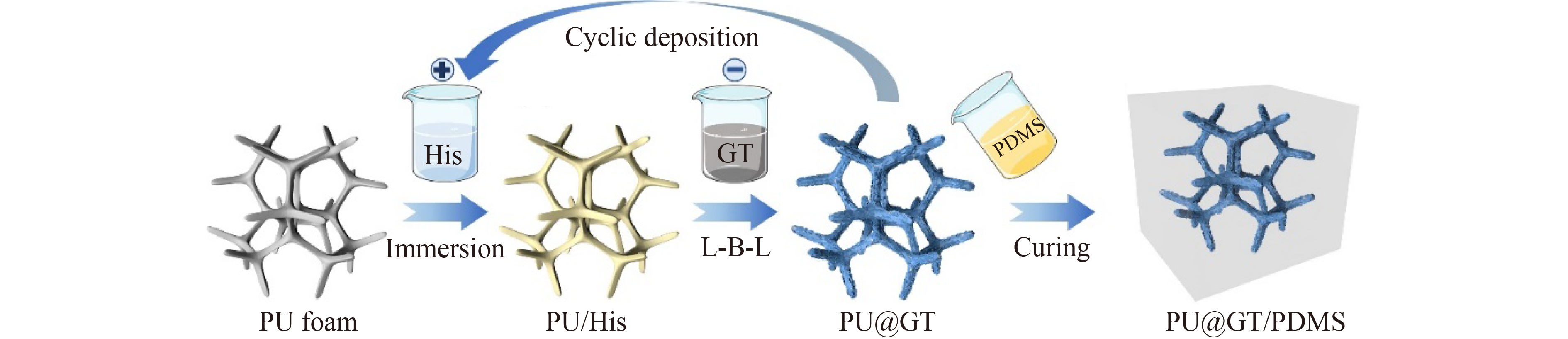 Polyurethane (PU) foams are widely used in thermal management materials due to their good flexibility. However, their low thermal conductivity limits the efficiency. To address this issue, we developed a new method to produce tannic acid (TA)-modified graphene nanosheets (GTs)-encapsulated PU (PU@GT) foams using the soft template microstructure and a facile layer-by-layer (L-B-L) assembly method. The resulting PU@GT scaffolds have ordered and tightly stacked GTs layers that act as three-dimensional (3D) highly interconnected thermal networks. These networks are further infiltrated with polydimethylsiloxane (PDMS). The through-plane thermal conductivity of the polymer composite reaches 1.58 W·m−1·K−1 at a low filler loading of 7.9 wt.%, which is 1115% higher than that of the polymer matrix. Moreover, the mechanical property of the composite is ~2 times higher than that of the polymer matrix while preserving good flexibility of the polymer matrix owing to the retention of the PU foam template and the construction of a stable 3D graphene network. This work presents a facile and scalable production approach to fabricate lightweight PU@GT/PDMS polymer composites with excellent thermal and mechanical performance, which implies a promising future in thermal management systems of electronic devices.