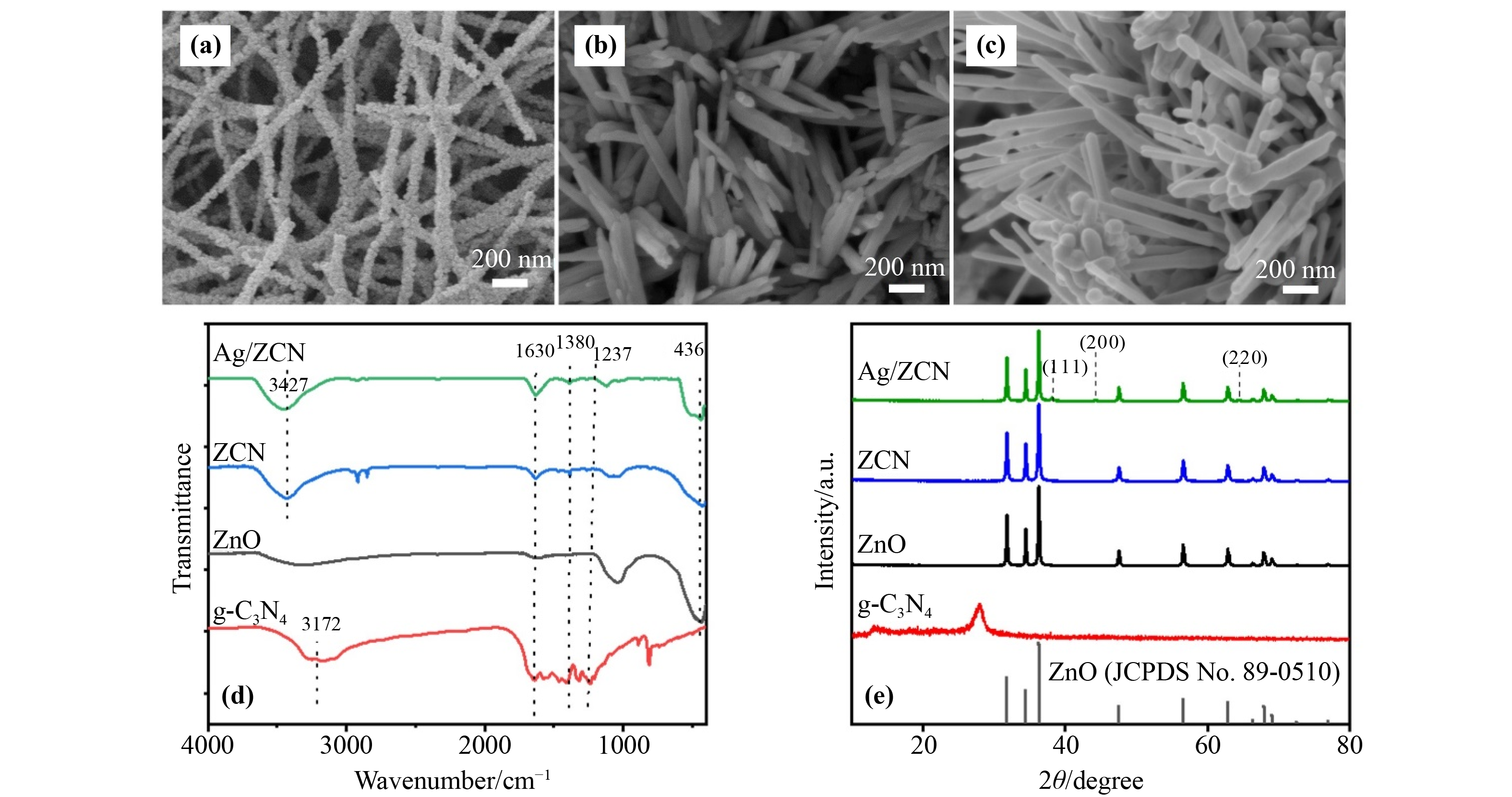 With the accelerated development of urbanization, it is urgent to develop new green and effective fungicides for water disinfection, which can effectively sterilize without causing bacterial drug resistance and environmental burden. In this work, the new ternary nanofiber (NF) heterojunctions, Ag/ZnO/g-C3N4 (Ag/ZCN), with high specific surface area were controllably fabricated through the photodeposition of different amounts of Ag quantum dots on electrospun ZCN NFs. Ag/ZCN with 6 wt.% Ag was found to exhibit the highest antibacterial activity superior to that of ZCN and ZnO NFs, which completely killed E. coli or S. aureus within 30 min under solar light. Moreover, it maintained high stability during four consecutive photocatalytic cycles. The photocatalytic Z-scheme charge transportation mechanism of Ag/ZCN was confirmed through structure characterization and free radical capture experiments. It was verified that the active oxygen substances such as ∙OH, 1O2, and a certain amount of ∙O2− were mainly produced in the photocatalytic sterilization process. Therefore, the Z-scheme NF heterojunction Ag/ZCN has great application potential in actual environmental water disinfection.