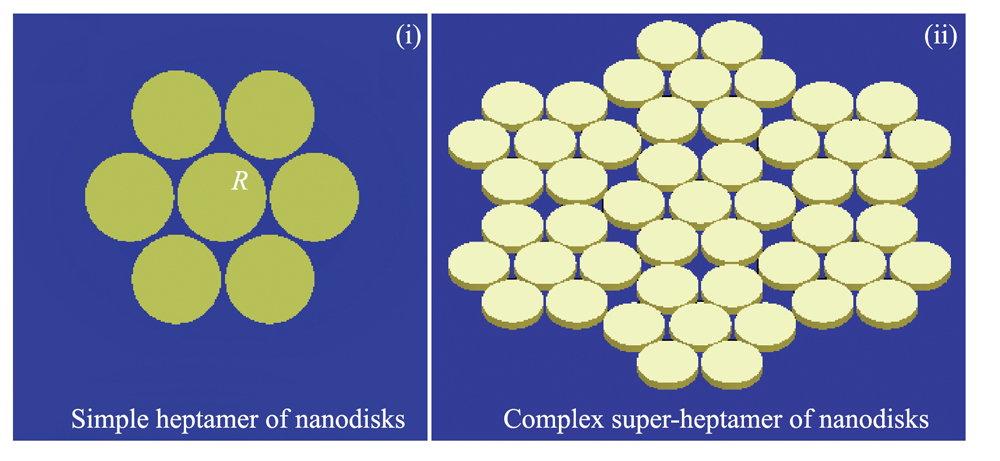 In this study, gold nanodisk clusters in heptamer orientations as clusters were used to design a super-heptamer consisting of one central and six peripheral heptamers. We examined the position and movement of the plasmon and Fano resonances by sketching the spectral response of the superstructure for various nanodisk dimensions. The quality of the interference between the superradiant and subradiant plasmon resonance modes of the nanodisk clusters was found to depend strongly on the structural configuration and the refractive index of the environmental medium. We replaced the central heptamer with a nanodisk and probed the position of the Fano resonance by geometrically altering the nanodisk structure. Finally, the effect of the dielectric environment on the plasmon response of both of the studied structures was examined numerically and theoretically. The localized surface plasmon resonance sensitivity of the finite plasmonic structures to the presence of liquid substances was investigated and shown by plotting the linear figure of merit. The finite-difference time-domain method was used as a numerical tool to investigate the plasmon response of the structure.