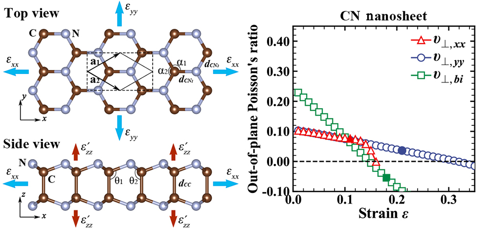 Due to the noticeable structural similarity and being neighborhood in periodic table of group-IV and-V elemental monolayers, whether the combination of group-IV and-V elements could have stable nanosheet structures with optimistic properties has attracted great research interest. In this work, we performed first-principles simulations to investigate the elastic, vibrational and electronic properties of the carbon nitride (CN) nanosheet in the puckered honeycomb structure with covalent interlayer bonding. It has been demonstrated that the structural stability of CN nanosheet is essentially maintained by the strong interlayer σ bonding between adjacent carbon atoms in the opposite atomic layers. A negative Poisson’s ratio in the out-of-plane direction under biaxial deformation, and the extreme in-plane stiffness of CN nanosheet, only slightly inferior to the monolayer graphene, are revealed. Moreover, the highly anisotropic mechanical and electronic response of CN nanosheet to tensile strain have been explored.