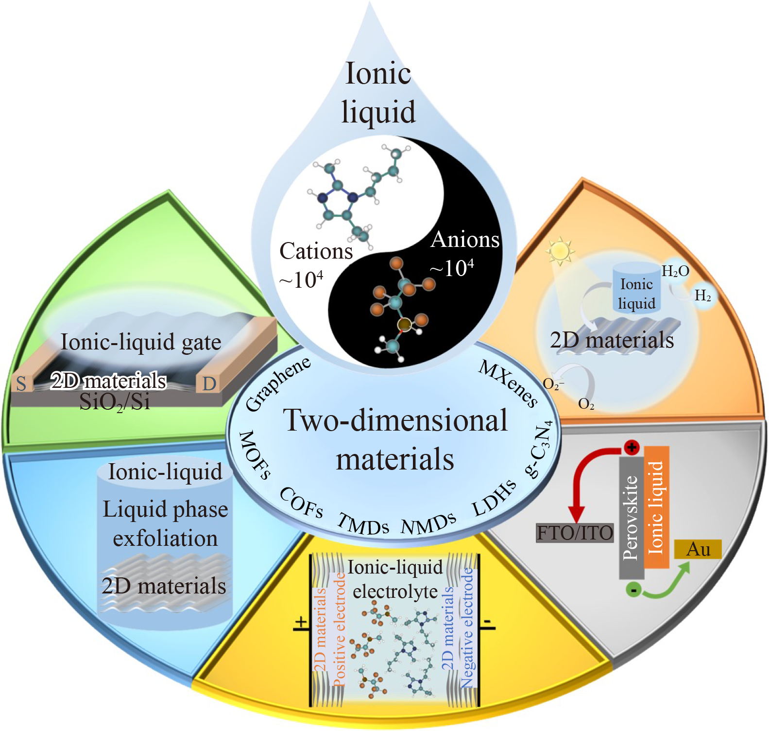 Ionic liquids (ILs) are expected to be used as readily available “designer” solvents, characterized by a number of tunable properties that can be obtained by modulating anion and cation combinations and ion chain lengths. Among them, its high ionicity is outstanding in the preparation and property modulation of two-dimensional (2D) materials. In this review, we mainly focus on the ILs-assisted exfoliation of 2D materials towards large-scale as well as functionalization. Meanwhile, electric-field controlled ILs-gating of 2D material systems have shown novel electronic, magnetic, optical and superconducting properties, attracting a broad range of scientific research activities. Moreover, ILs have also been extensively applied in various field practically. We summarize the recent developments of ILs modified 2D material systems from the electrochemical, solar cells and photocatalysis aspects, discuss their advantages and possibilities as “designer solvent”. It is believed that the design of ILs accompanying with diverse 2D materials will not only solve several scientific problems but also enrich materials design and engineer of 2D materials.