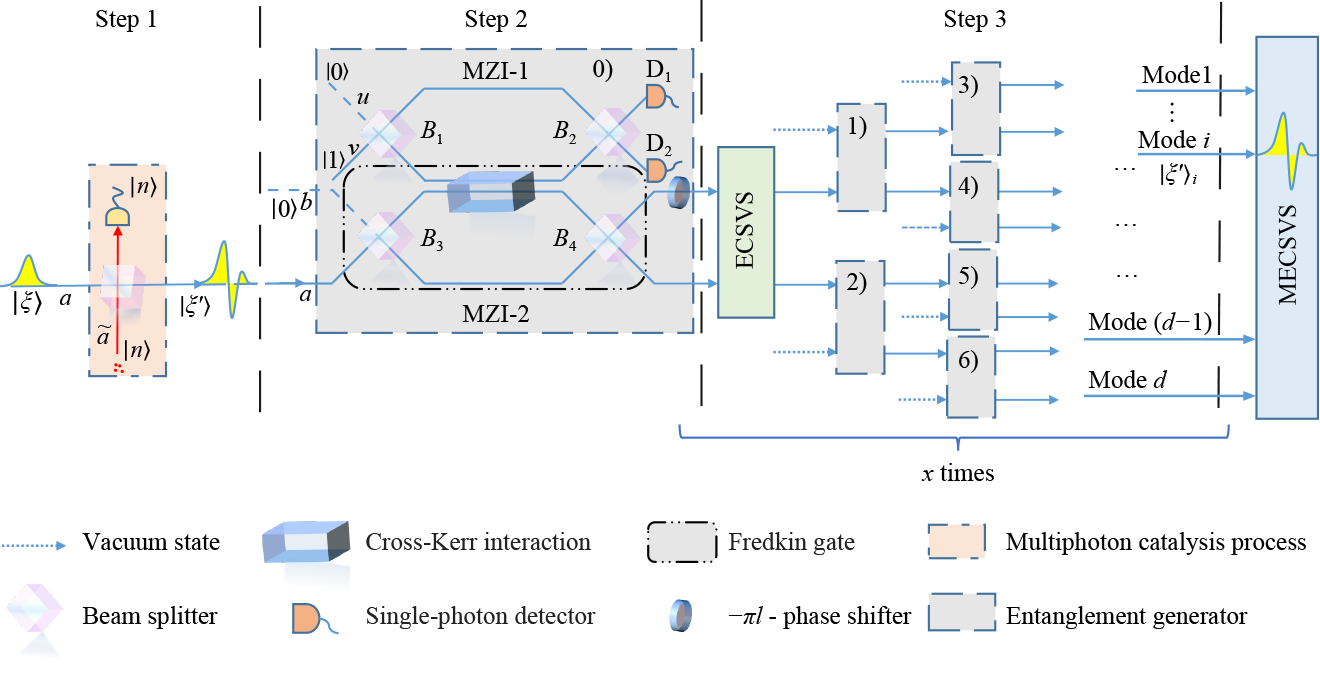 We propose a method to generate the multi-mode entangled catalysis squeezed vacuum states (MECSVS) by embedding the cross-Kerr nonlinear medium into the Mach−Zehnder interferometer. This method realizes the exchange of quantum states between different modes based on Fredkin gate. In addition, we study the MECSVS as the probe state of multi-arm optical interferometer to realize multi-phase simultaneous estimation. The results show that the quantum Cramer−Rao bound (QCRB) of phase estimation can be improved by increasing the number of catalytic photons or decreasing the transmissivity of the optical beam splitter using for photon catalysis. In addition, we also show that even if there is photon loss, the QCRB of our photon catalysis scheme is lower than that of the ideal entangled squeezed vacuum states (ESVS), which shows that by performing the photon catalytic operation is more robust against photon loss than that without the catalytic operation. The results here can find applications in quantum metrology for multiparatmeter estimation.