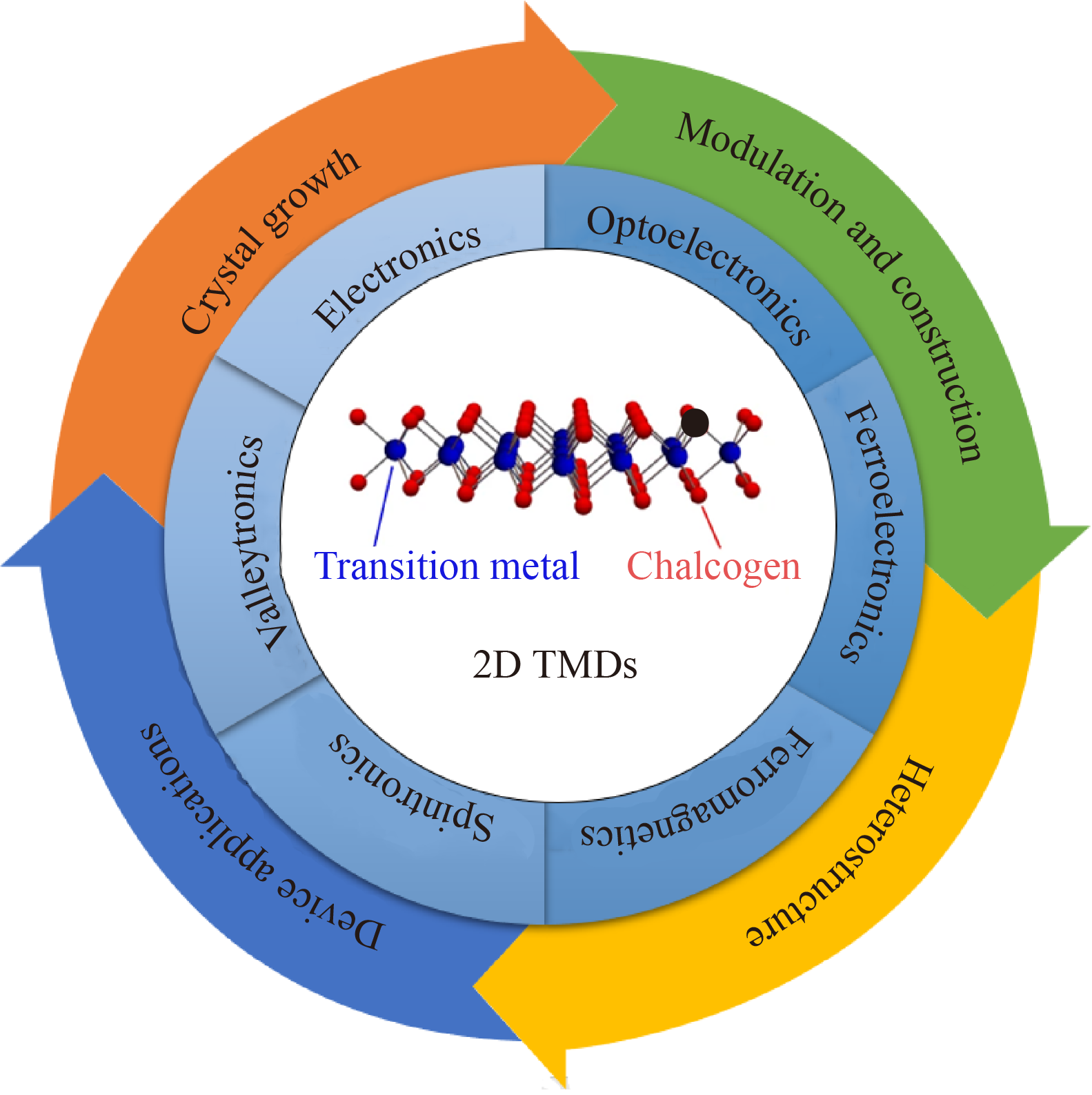 Two-dimensional (2D) transition metal dichalcogenides (TMDs) with fascinating electronic energy band structures, rich valley physical properties and strong spin–orbit coupling have attracted tremendous interest, and show great potential in electronic, optoelectronic, spintronic and valleytronic fields. Stacking 2D TMDs have provided unprecedented opportunities for constructing artificial functional structures. Due to the low cost, high yield and industrial compatibility, chemical vapor deposition (CVD) is regarded as one of the most promising growth strategies to obtain high-quality and large-area 2D TMDs and heterostructures. Here, state-of-the-art strategies for preparing TMDs details of growth control and related heterostructures construction via CVD method are reviewed and discussed, including wafer-scale synthesis, phase transition, doping, alloy and stacking engineering. Meanwhile, recent progress on the application of multi-functional devices is highlighted based on 2D TMDs. Finally, challenges and prospects are proposed for the practical device applications of 2D TMDs.