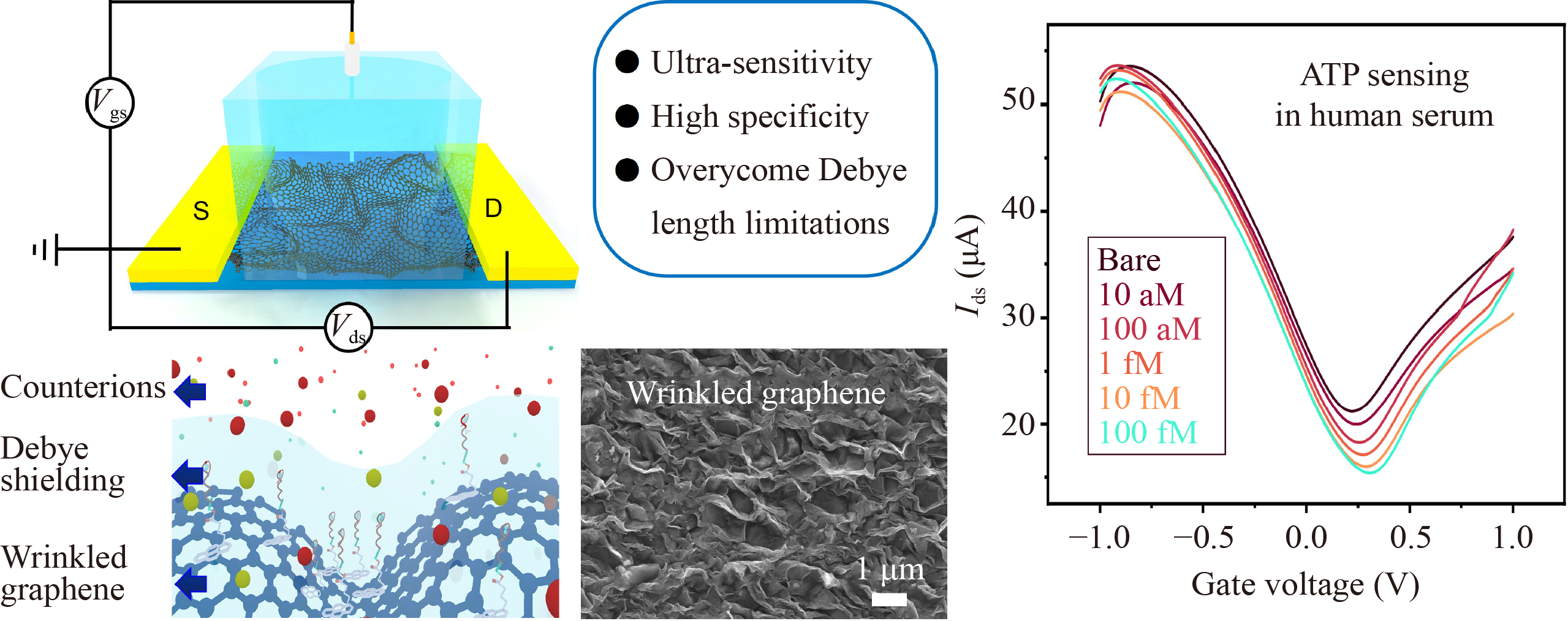 Adenosine triphosphate (ATP) is closely related to the pathogenesis of certain diseases, so the detection of trace ATP is of great significance to disease diagnosis and drug development. Graphene field-effect transistors (GFETs) have been proven to be a promising platform for the rapid and accurate detection of small molecules, while the Debye shielding limits the sensitive detection in real samples. Here, a three-dimensional wrinkled graphene field-effect transistor (3D WG-FET) biosensor for ultra-sensitive detection of ATP is demonstrated. The lowest detection limit of 3D WG-FET for analyzing ATP is down to 3.01 aM, which is much lower than the reported results. In addition, the 3D WG-FET biosensor shows a good linear electrical response to ATP concentrations in a broad range of detection from 10 aM to 10 pM. Meanwhile, we achieved ultra-sensitive (LOD: 10 aM) and quantitative (range from 10 aM to 100 fM) measurements of ATP in human serum. The 3D WG-FET also exhibits high specificity. This work may provide a novel approach to improve the sensitivity for the detection of ATP in complex biological matrix, showing a broad application value for early clinical diagnosis and food health monitoring.