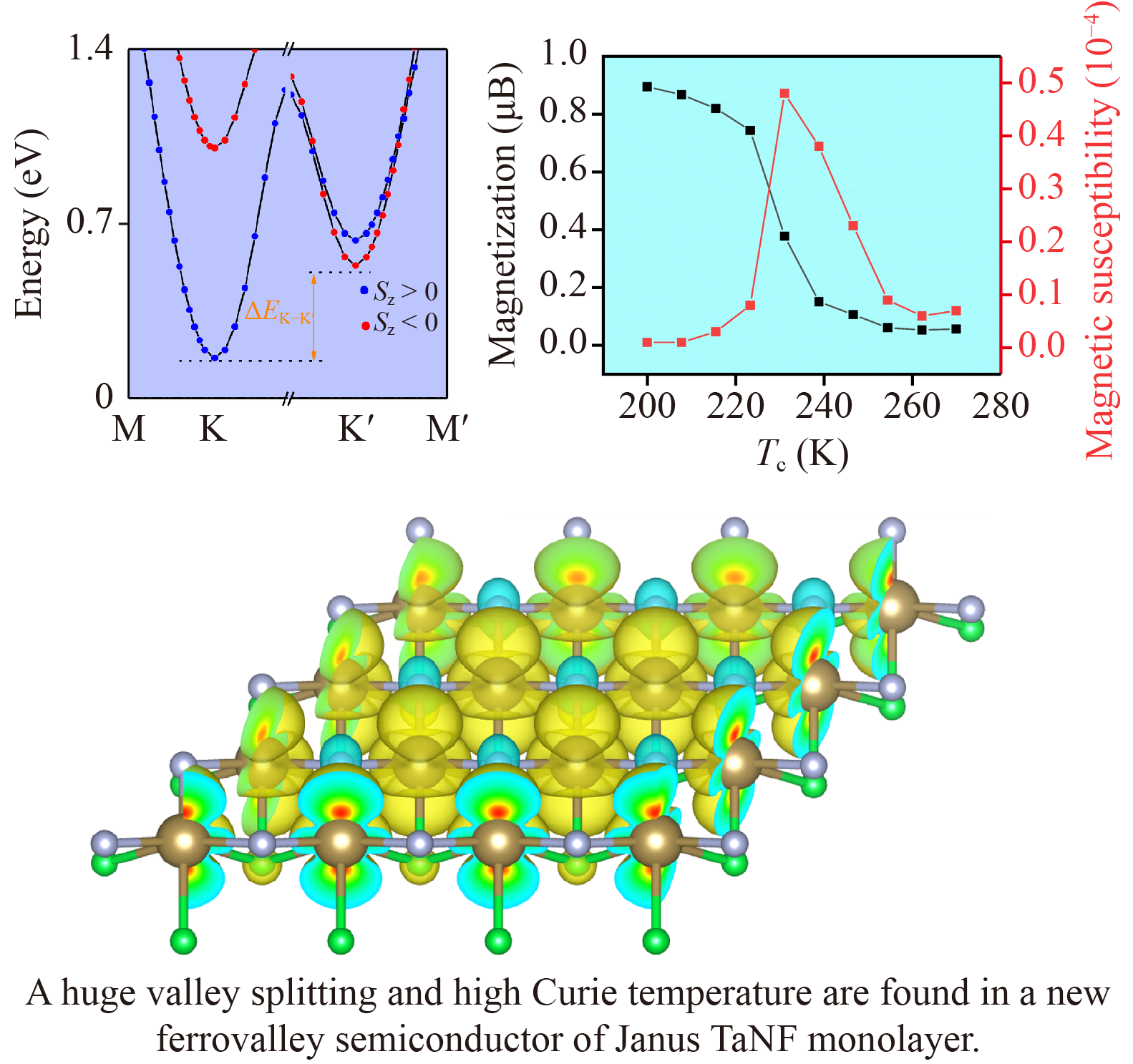 Materials with large intrinsic valley splitting and high Curie temperature are a huge advantage for studying valleytronics and practical applications. In this work, using first-principles calculations, a new Janus TaNF monolayer is predicted to exhibit excellent piezoelectric properties and intrinsic valley splitting, resulting from the spontaneous spin polarization, the spatial inversion symmetry breaking and strong spin−orbit coupling (SOC). TaNF is also a potential two-dimensional (2D) magnetic material due to its high Curie temperature and large magnetic anisotropy energy. The effective control of the band gap of TaNF can be achieved by biaxial strain, which can transform TaNF monolayer from semiconductor to semi-metal. The magnitude of valley splitting at the CBM can be effectively tuned by biaxial strain due to the changes of orbital composition at the valleys. The magnetic anisotropy energy (MAE) can be manipulated by changing the energy and occupation (unoccupation) states of d orbital compositions through biaxial strain. In addition, Curie temperature reaches 373 K under only −3% biaxial strain, indicating that Janus TaNF monolayer can be used at high temperatures for spintronic and valleytronic devices.
