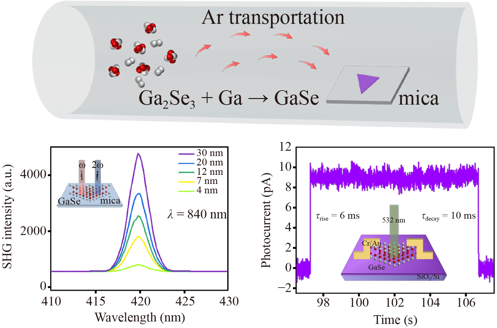 As an emerging group III−VI semiconductor two-dimensional (2D) material, gallium selenide (GaSe) has attracted much attention due to its excellent optical and electrical properties. In this work, high-quality epitaxial growth of few-layer GaSe nanoflakes with different thickness is achieved via chemical vapor deposition (CVD) method. Due to the non-centrosymmetric structure, the grown GaSe nanoflakes exhibits excellent second harmonic generation (SHG). In addition, the constructed GaSe nanoflake-based photodetector exhibits stable and fast response under visible light excitation, with a rise time of 6 ms and decay time of 10 ms. These achievements clearly demonstrate the possibility of using GaSe nanoflake in the applications of nonlinear optics and (opto)-electronics.